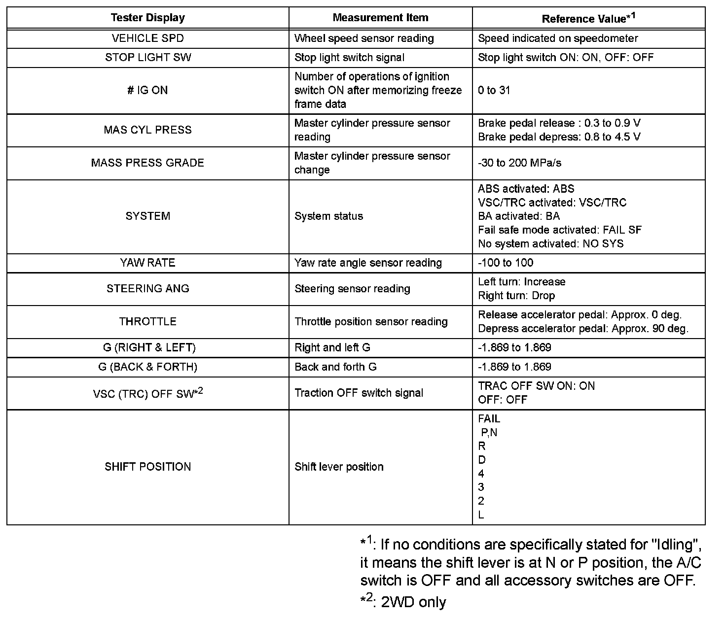 FREEZE FRAME DATAa. The vehicle (sensor) status, stored during ABS and/ or VSC operation or at the time of an error code detection, can be displayed by the intelligent tester.