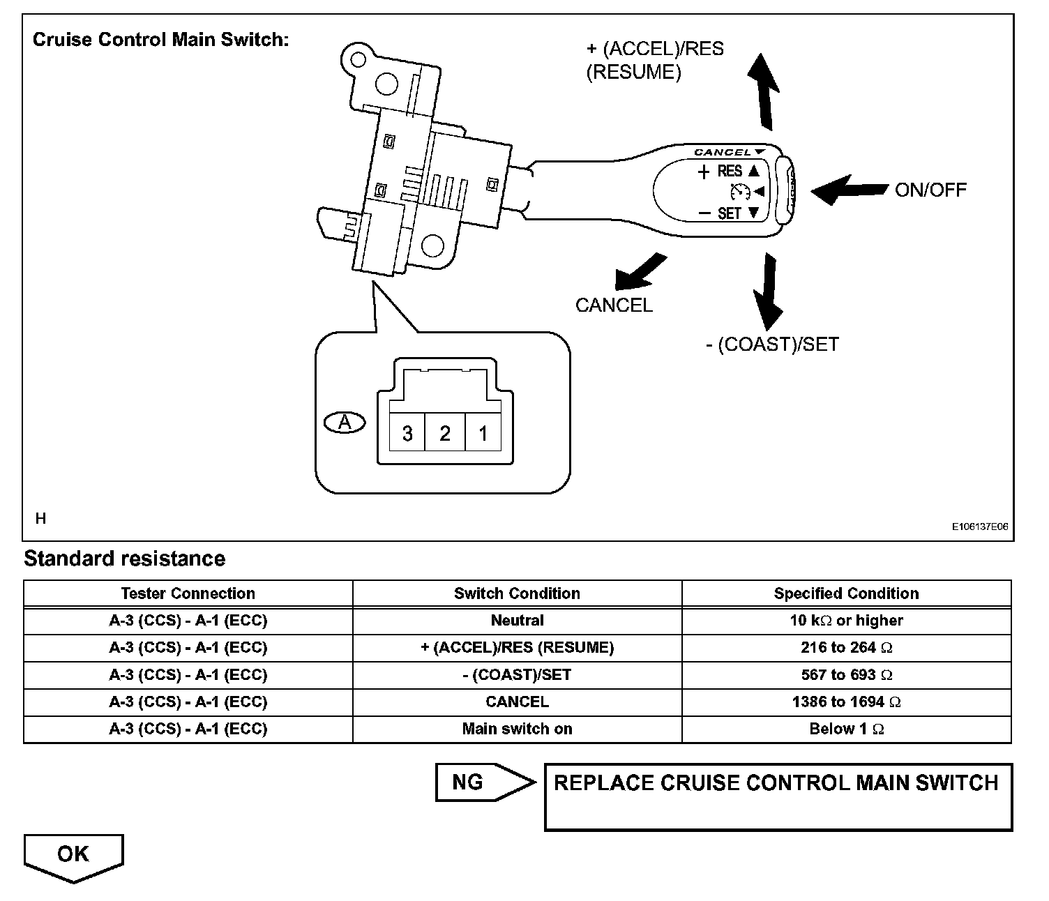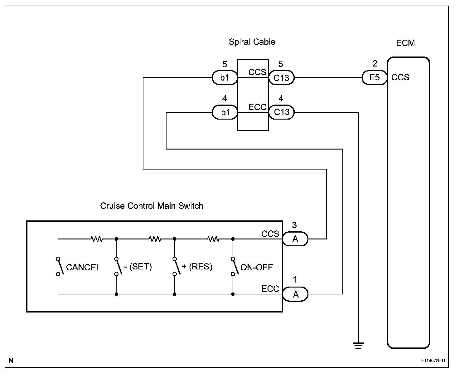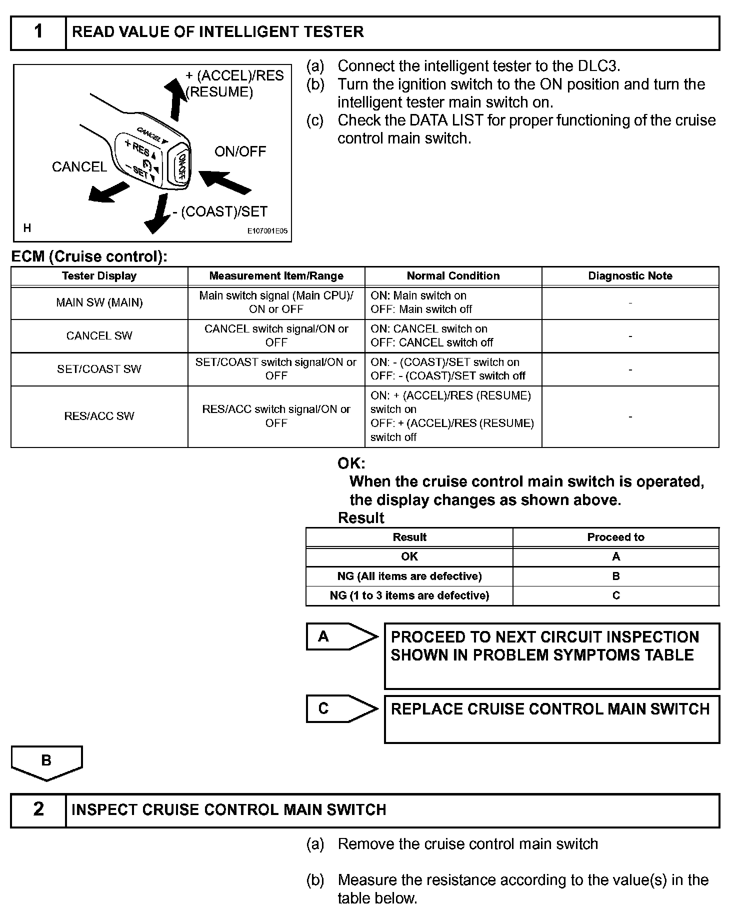The cruise control main switch operates 7 functions: SET, - (COAST), TAP-DOWN, RES (RESUME), + (ACCEL), TAP-UP, and CANCEL. The SET, TAP-DOWN, and - (COAST) functions, and the RES (RESUME), TAP-UP, and + (ACCEL) functions are operated with the same switch The cruise control main switch is an automatic return type switch which turns on only while operating it in the direction of each arrow and turns off after releasing it The internal contact point of the cruise control main switch is turned on with the switch operation Then the ECM reads the voltage value that has been changed by the switch operation to control SET, - (COAST), RES (RESUME), + (ACCEL), and CANCEL.
