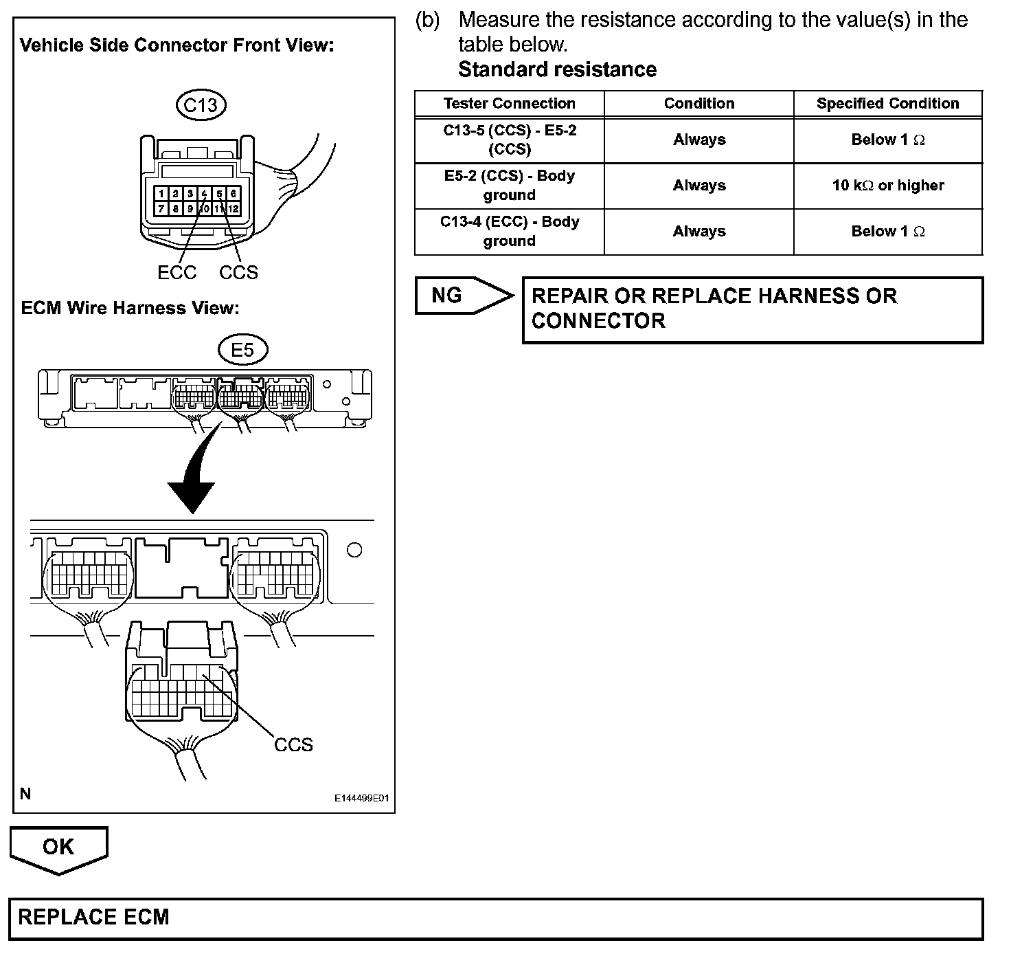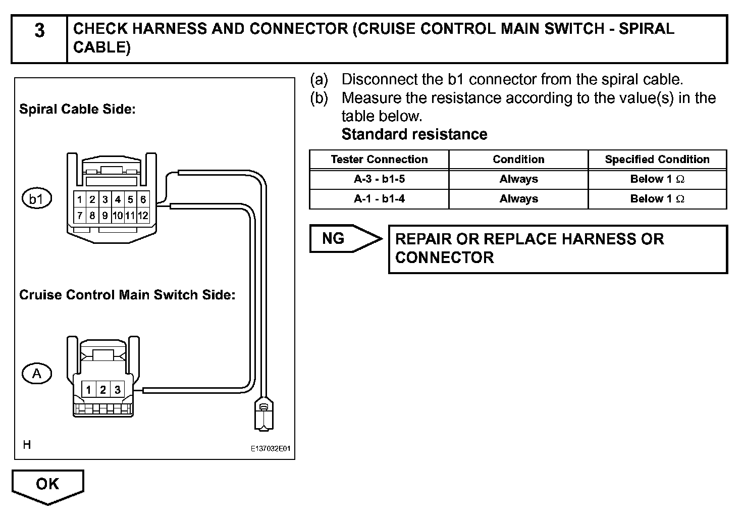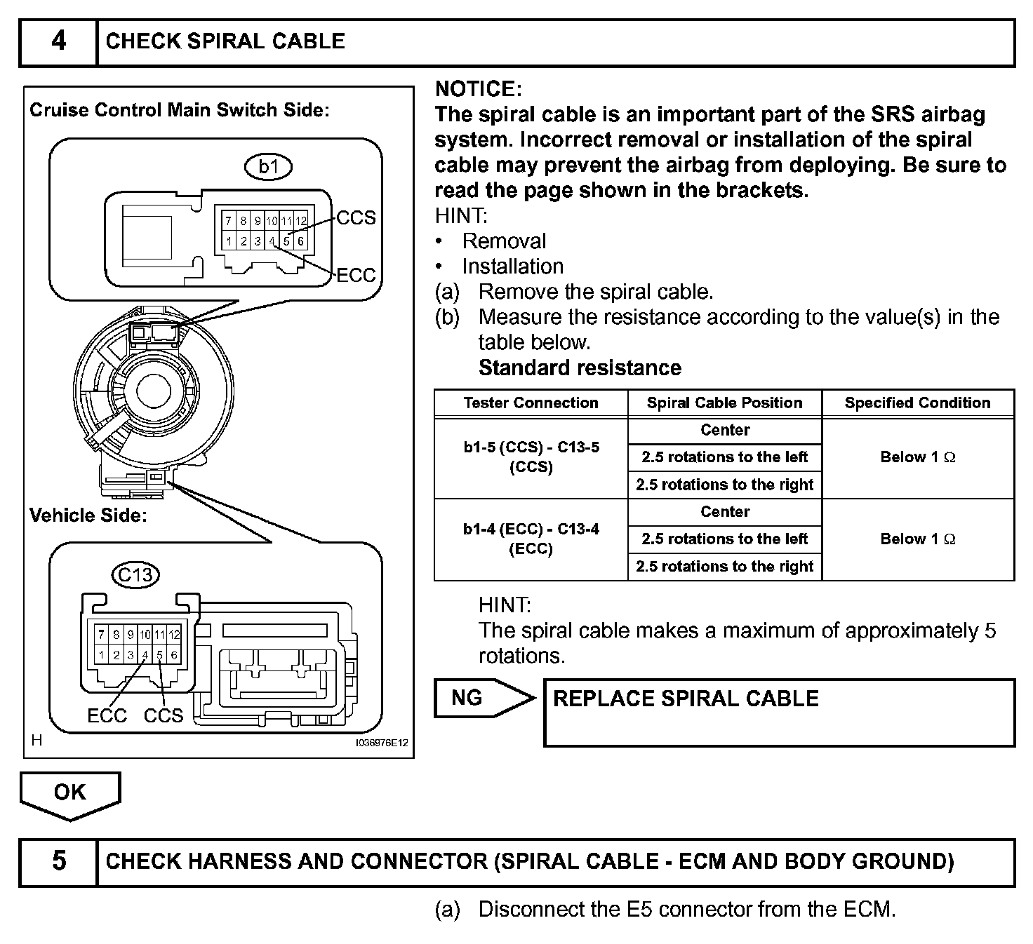 The cruise control main switch operates 7 functions: SET, - (COAST), TAP-DOWN, RES (RESUME), + (ACCEL), TAP-UP, and CANCEL. The SET, TAP-DOWN, and - (COAST) functions, and the RES (RESUME), TAP-UP, and + (ACCEL) functions are operated with the same switch The cruise control main switch is an automatic return type switch which turns on only while operating it in the direction of each arrow and turns off after releasing it The internal contact point of the cruise control main switch is turned on with the switch operation Then the ECM reads the voltage value that has been changed by the switch operation to control SET, - (COAST), RES (RESUME), + (ACCEL), and CANCEL.