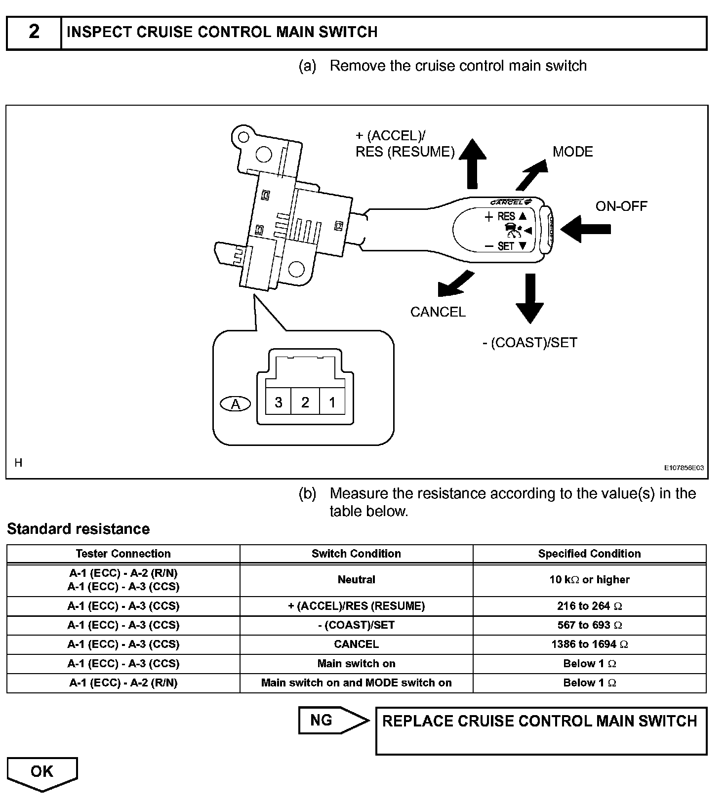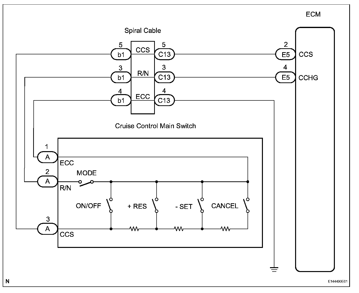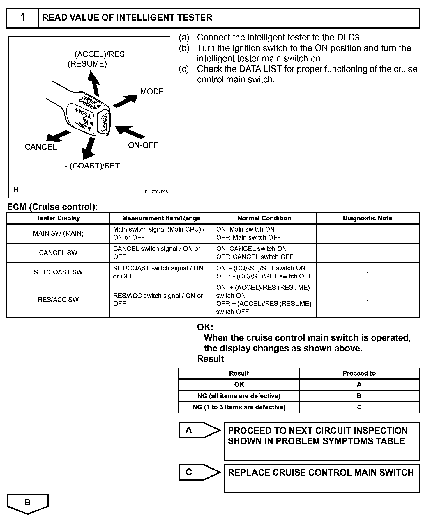 The cruise control main switch operates 8 functions: SET, - (COAST), TAP-DOWN, RES (RESUME), + (ACCEL), TAP-UP, CANCEL, and MODE. The SET, TAP-DOWN, and - (COAST) functions, and the RES (RESUME), TAP-UP, and + (ACCEL) functions are operated with the same switch. The cruise control main switch is an automatic return type switch which turns on only while operating it in the direction of each arrow and turns off after releasing it. The internal contact point of the cruise control main switch is turned on with the switch operation. The ECM then reads the voltage value that has been changed by the switch operation to control MODE, SET, - (COAST), RES (RESUME), + (ACCEL), and CANCEL. The dynamic laser cruise control system has two cruise control modes: the constant speed control mode and vehicle-to-vehicle distance control mode.