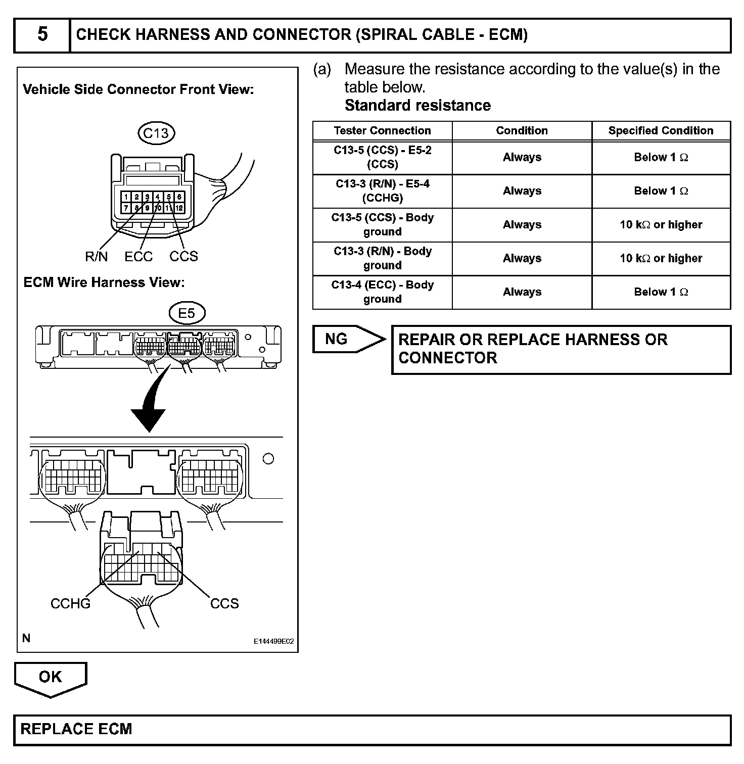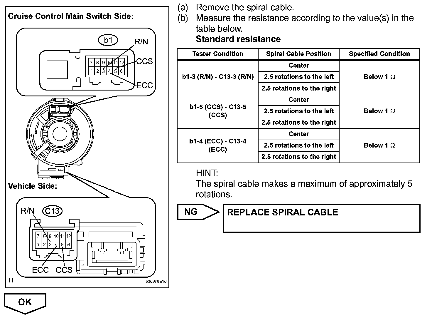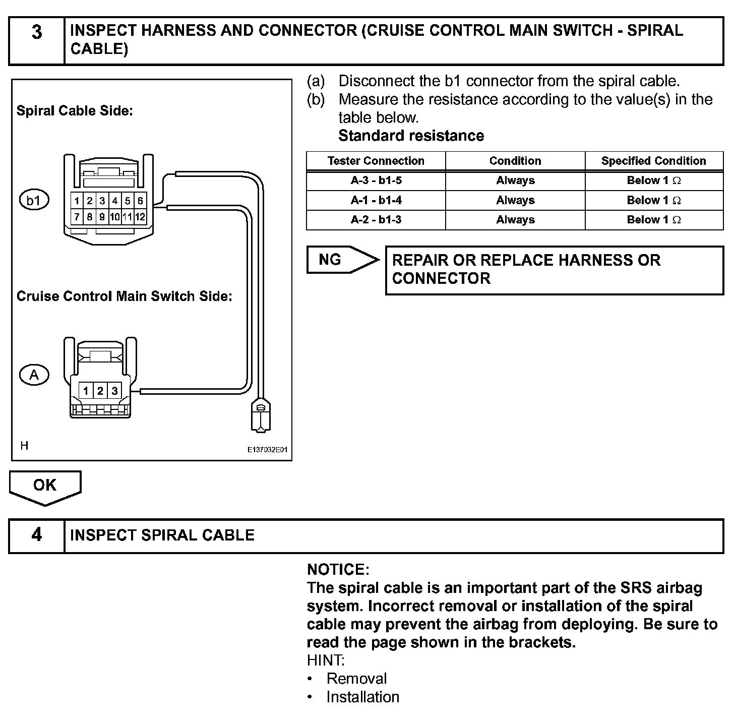 The cruise control main switch operates 8 functions: SET, - (COAST), TAP-DOWN, RES (RESUME), + (ACCEL), TAP-UP, CANCEL, and MODE. The SET, TAP-DOWN, and - (COAST) functions, and the RES (RESUME), TAP-UP, and + (ACCEL) functions are operated with the same switch. The cruise control main switch is an automatic return type switch which turns on only while operating it in the direction of each arrow and turns off after releasing it. The internal contact point of the cruise control main switch is turned on with the switch operation. The ECM then reads the voltage value that has been changed by the switch operation to control MODE, SET, - (COAST), RES (RESUME), + (ACCEL), and CANCEL. The dynamic laser cruise control system has two cruise control modes: the constant speed control mode and vehicle-to-vehicle distance control mode.
