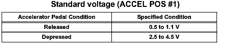 If the result is not as specified, check the accelerator pedal rod, wire harness or ECM.
