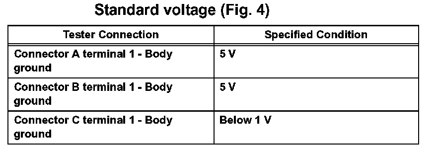 1. In a circuit in which voltage is applied to the ECU connector terminal, an open circuit can be checked by conducting a voltage check. With each connector still connected, measure the voltage between the body ground and these terminals (in this order): 1) terminal 1 of connector A, 2) terminal 1 of connector B, and 3) terminal 1 of connector C.