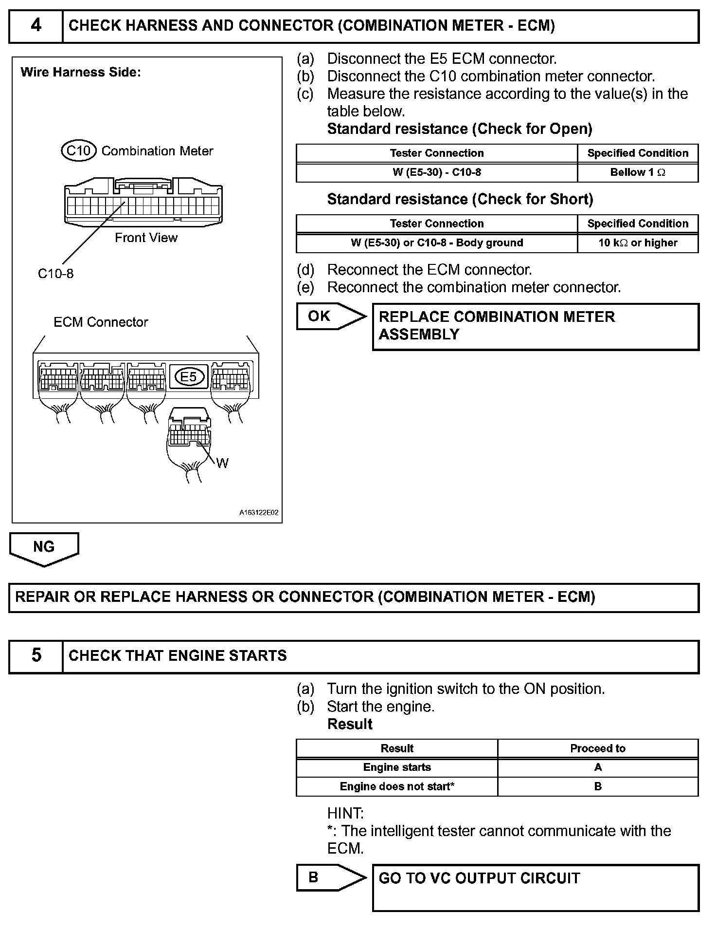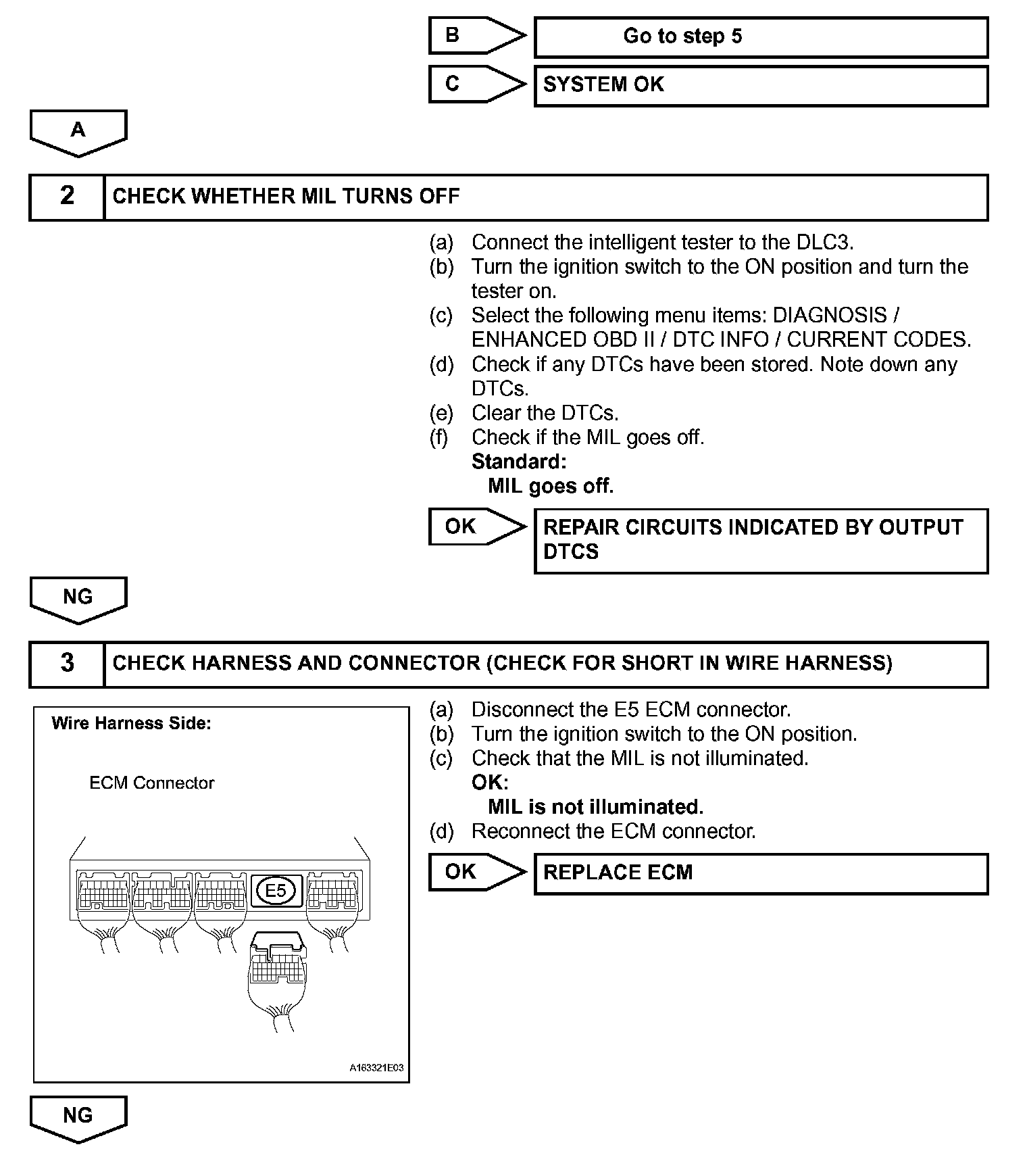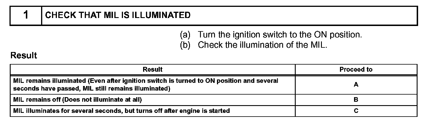 The MIL operation can be checked visually. When the ignition switch is first turned to the ON position, the MIL should be illuminated and should then turn off. If the MIL remains illuminated or is not illuminated, conduct the following troubleshooting procedure using the intelligent tester.
