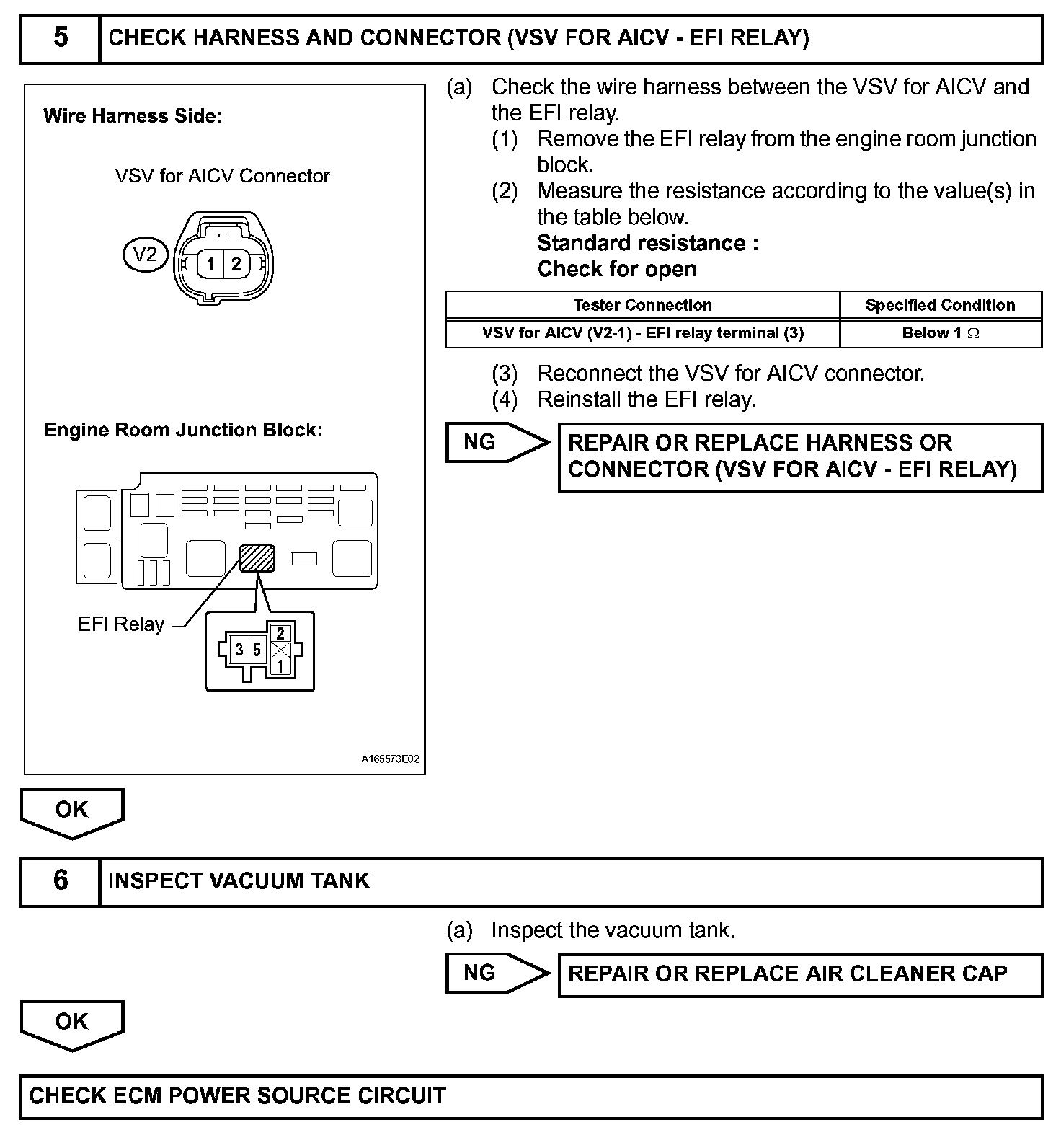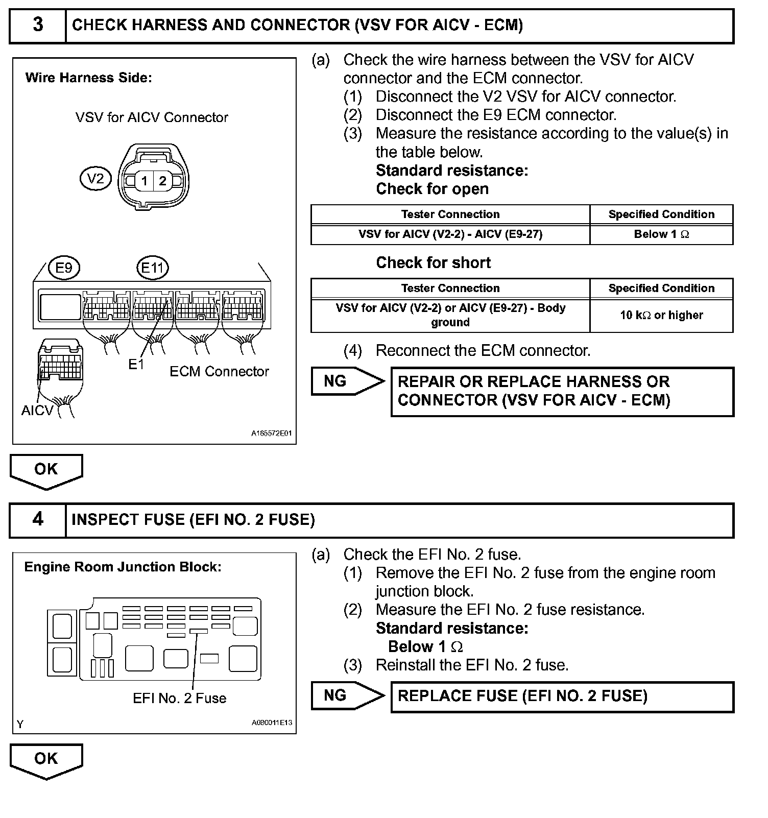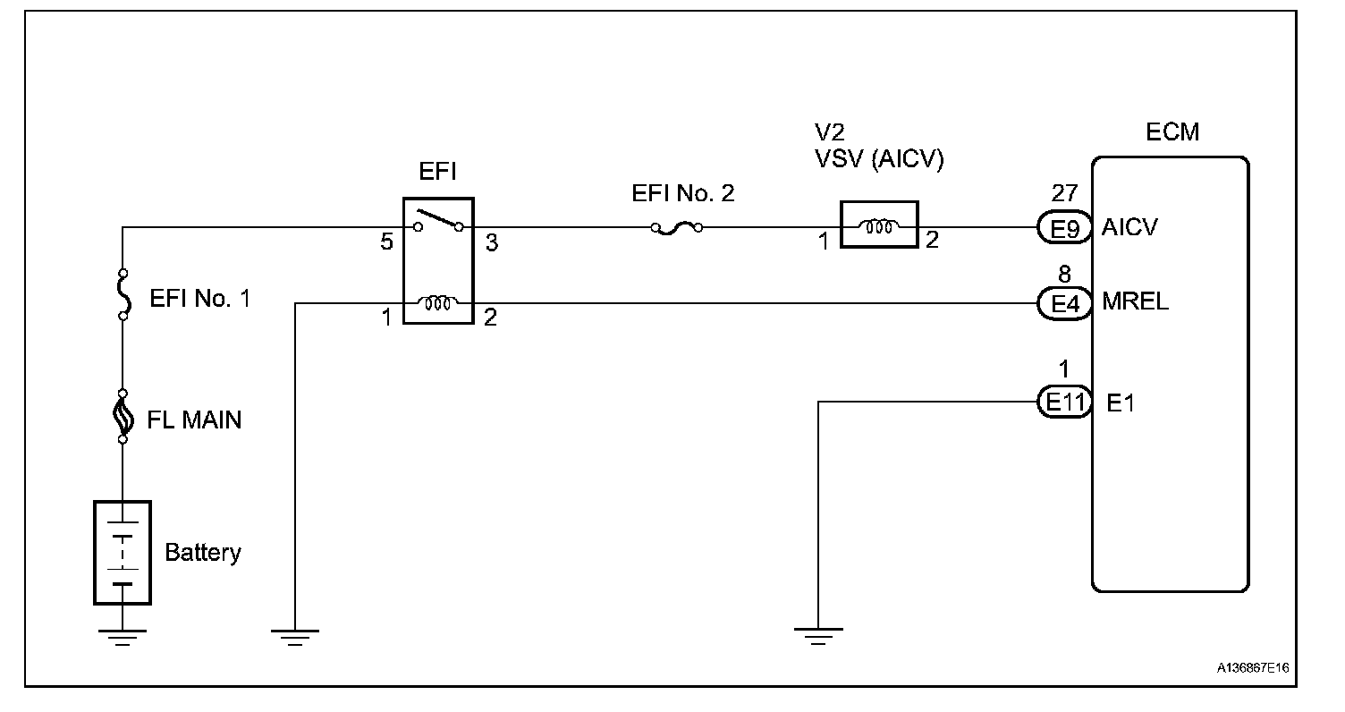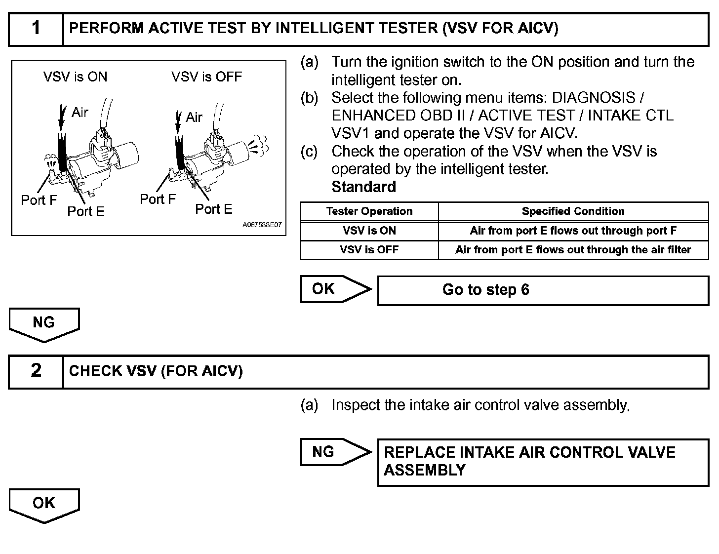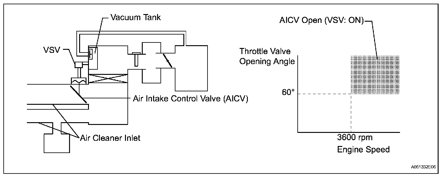 When the engine is operating in the low-to-mid speed range, this control operates the AICV to close one of the air cleaner inlets. When the engine speed is more than 3600 rpm and the opening angle of the throttle valve is more than 60 °, the ECM activates the VSV and opens the AICV.