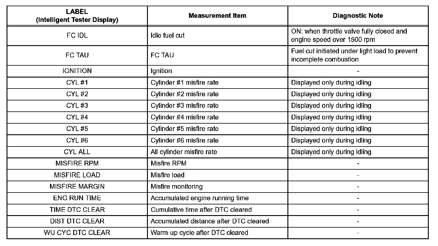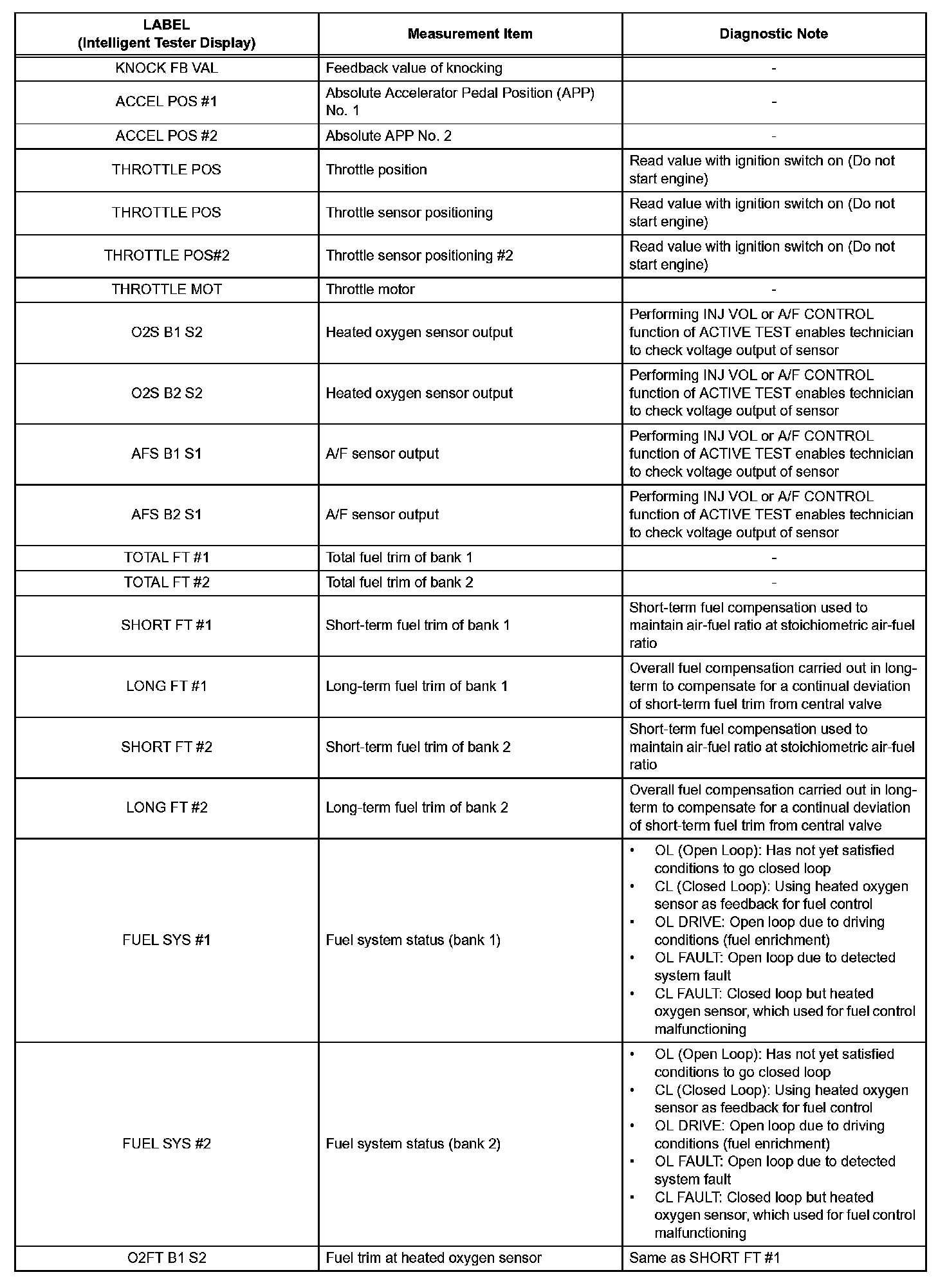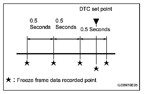 b. The ECM records engine conditions in the form of freeze frame data every 0.5 seconds. Using the intelligent tester, five separate sets of freeze frame data, including the data values at the time when the DTC was set, can be checked.