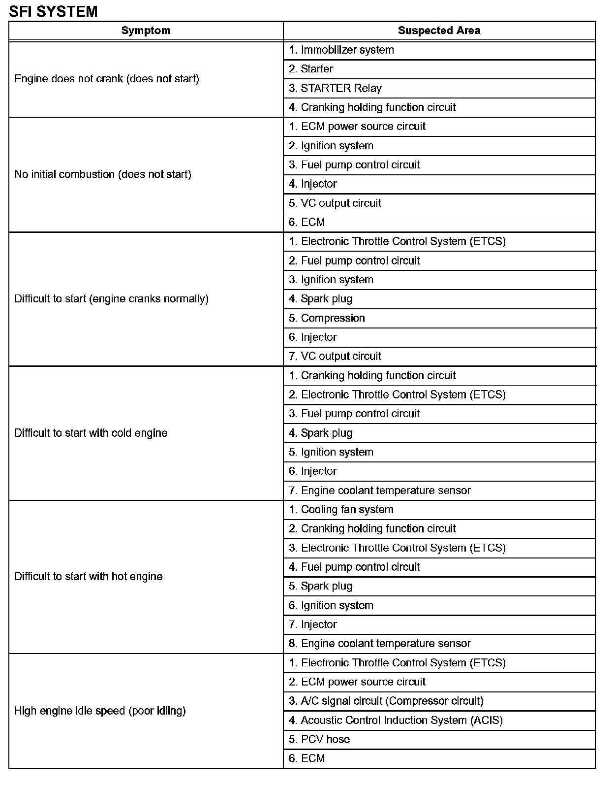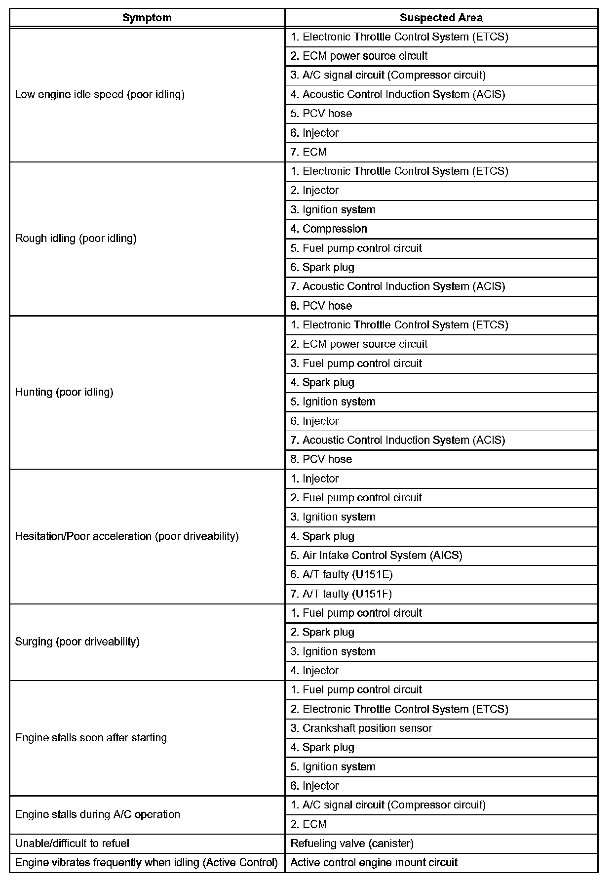 HINT: When a malfunction is not confirmed by a DTC (Diagnostic Trouble Code) check and the cause of problem cannot be identified through a basic inspection, troubleshoot according to the priority order indicated in the table.