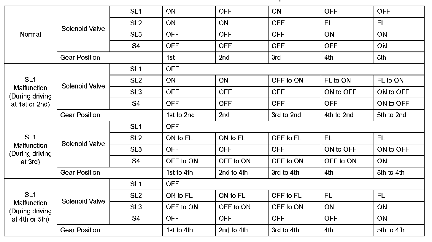 (d) Shift solenoid valve SL1, SL2, SL3 and S4: Fail safe function: If either of the shift solenoid valve circuits develops an open or short, the ECM turns the other shift solenoid "ON" and "OFF" in order to shift into the gear positions shown in the table.