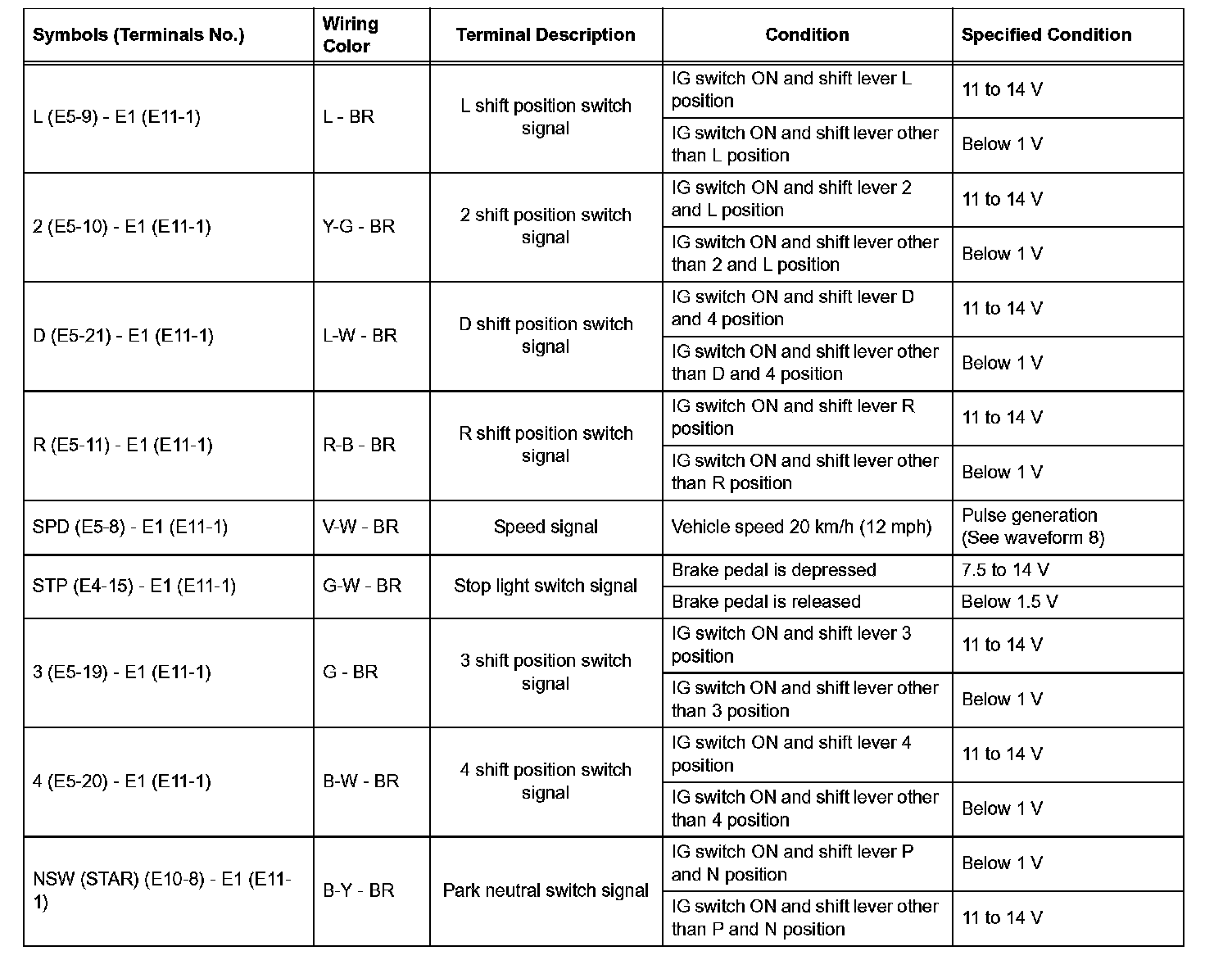 In the table, first follow the information under "Condition". Look under "Symbols (Terminal No.)" for the terminals to inspected. The standard voltage between the terminals is shown under "Specific Condition".