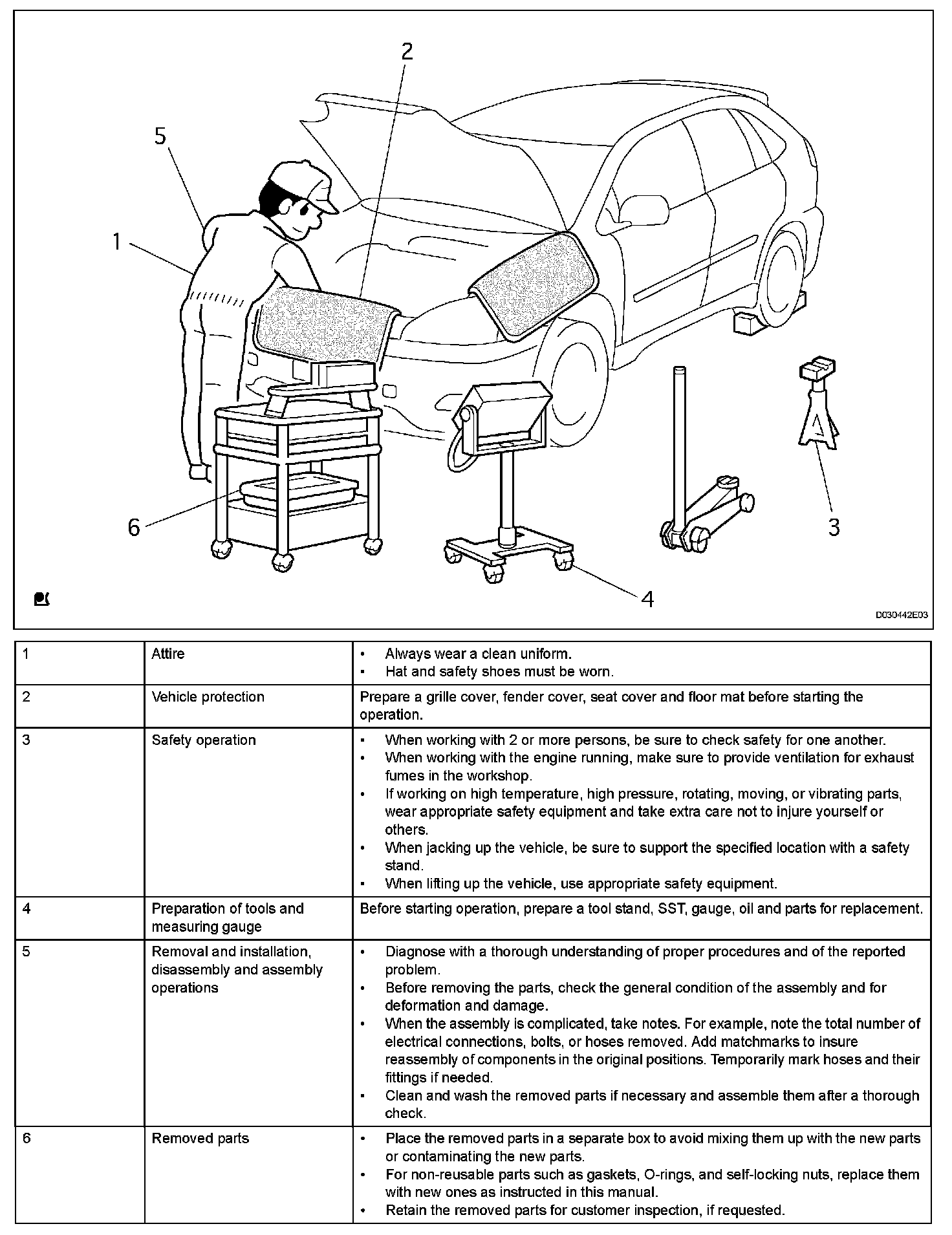 1. Care must be taken when jacking up and supporting the vehicle. Be sure to lift and support the vehicle at the proper locations.