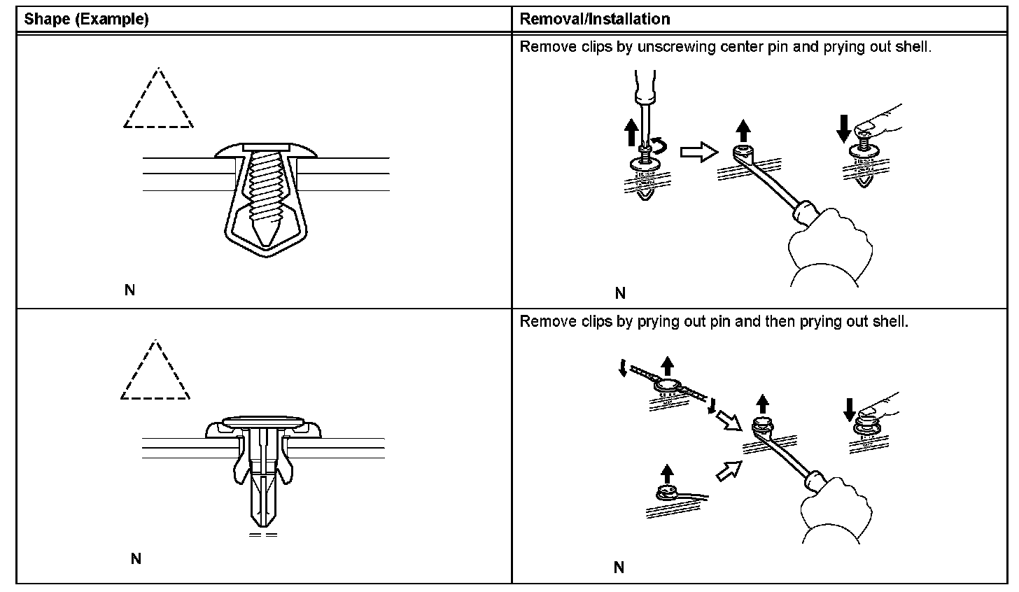 1. The removal and installation methods of typical clips used for vehicle body parts are shown in the table.
