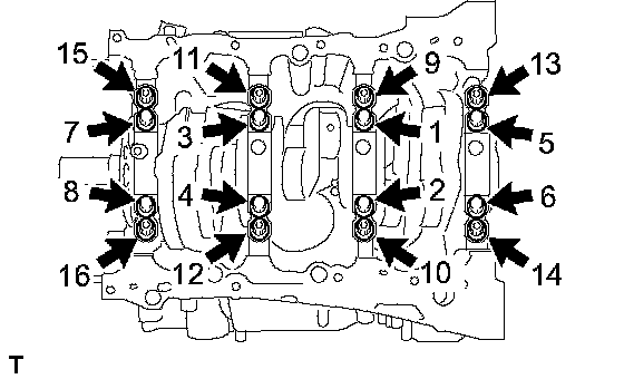 Install and uniformly tighten the 16 crankshaft bearing cap bolts in the sequence shown in the illustration.