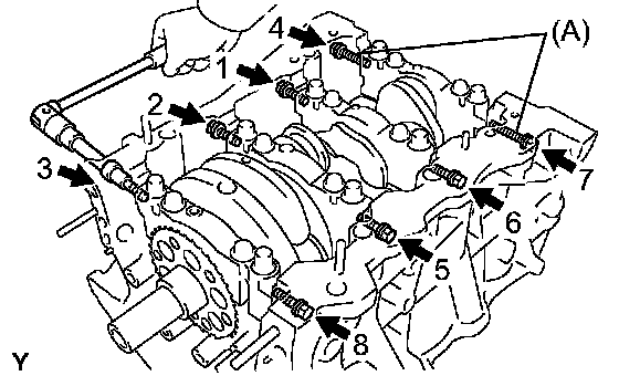 Install 8 new seal washers and uniformly tighten the 8 crankshaft bearing cap bolts in several steps and in the sequence shown in the illustration.