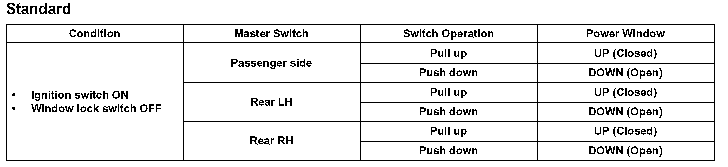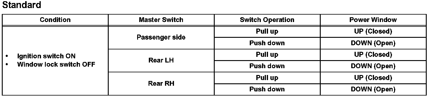 a. Check that the passenger side power window and slide door power window operation is disabled when the window lock switch of the power window master switch is pressed.