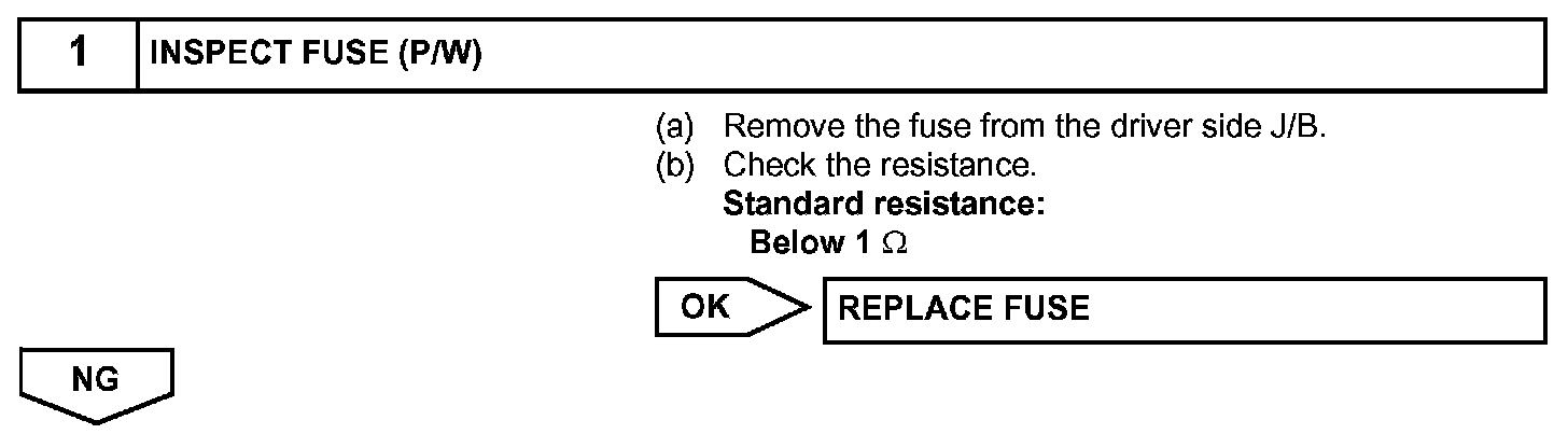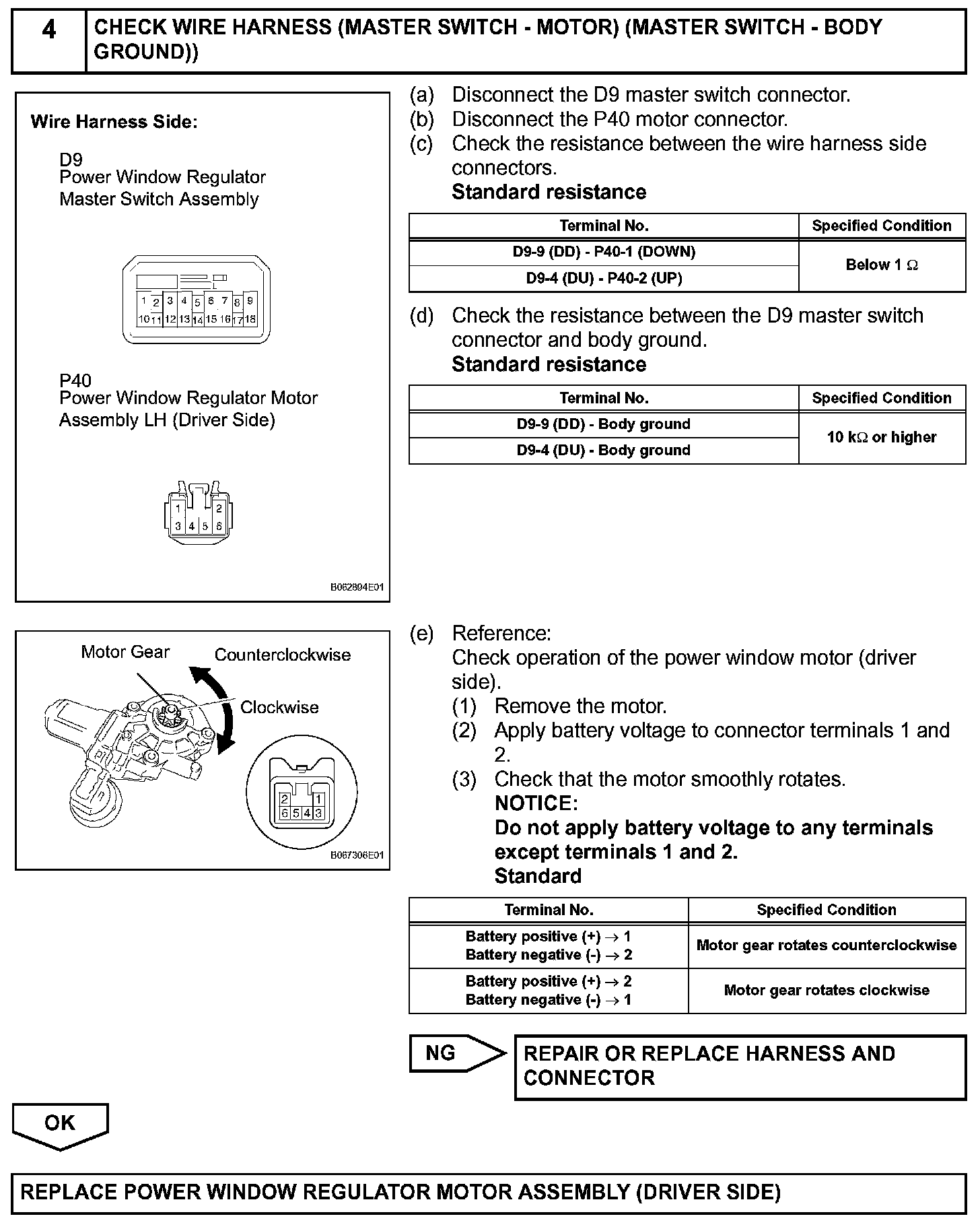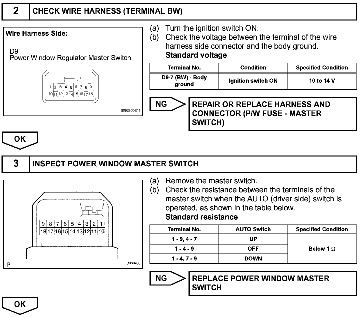 If the manual UP/DOWN function does not operate, no power may be supplied to the power window master switch or the power window motor. The power window master switch itself or the wire harness may be malfunctioning.