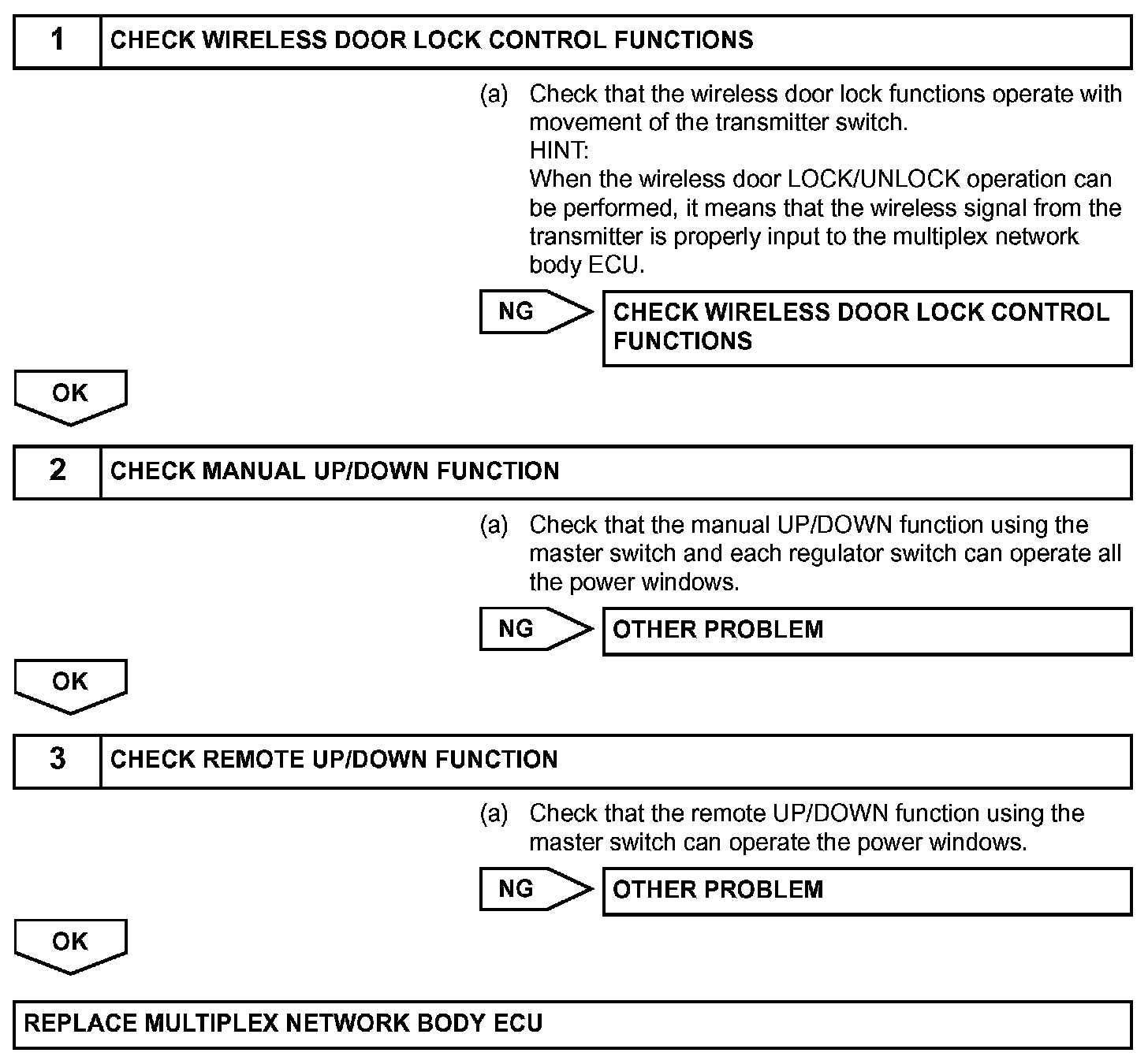 When the switch on the transmitter is operated during normal operating conditions, the multiplex network body ECU sends a request signal to the master switch and the regulator switches which then drive the applicable power window motors.