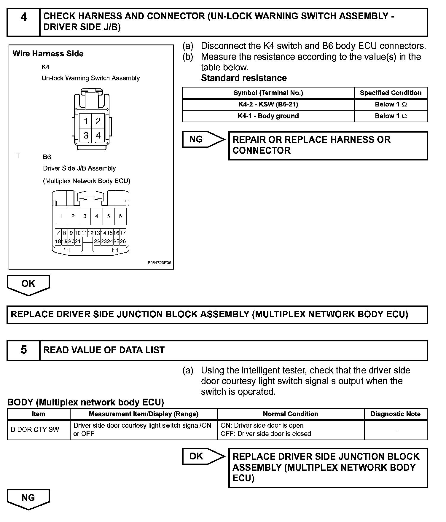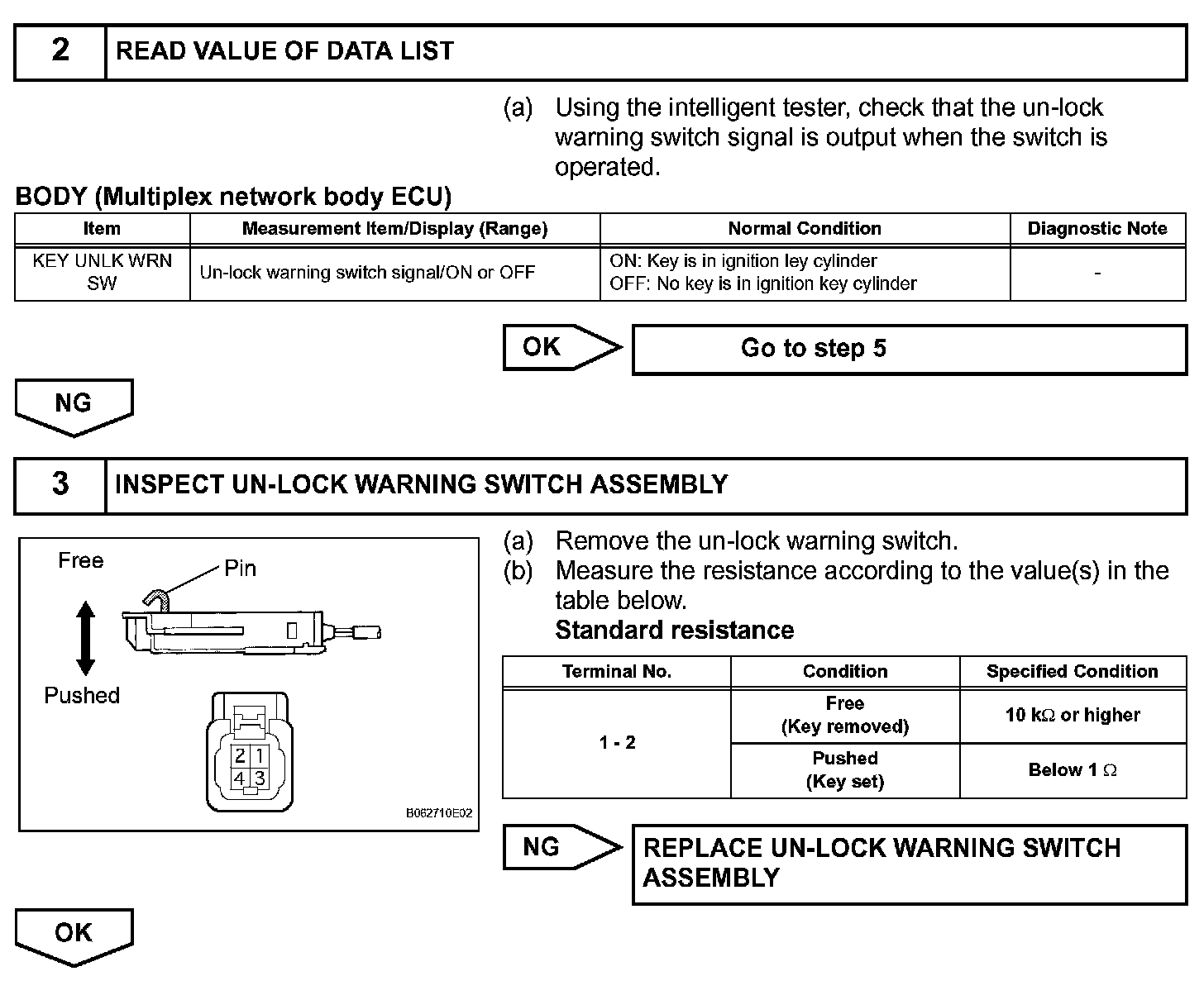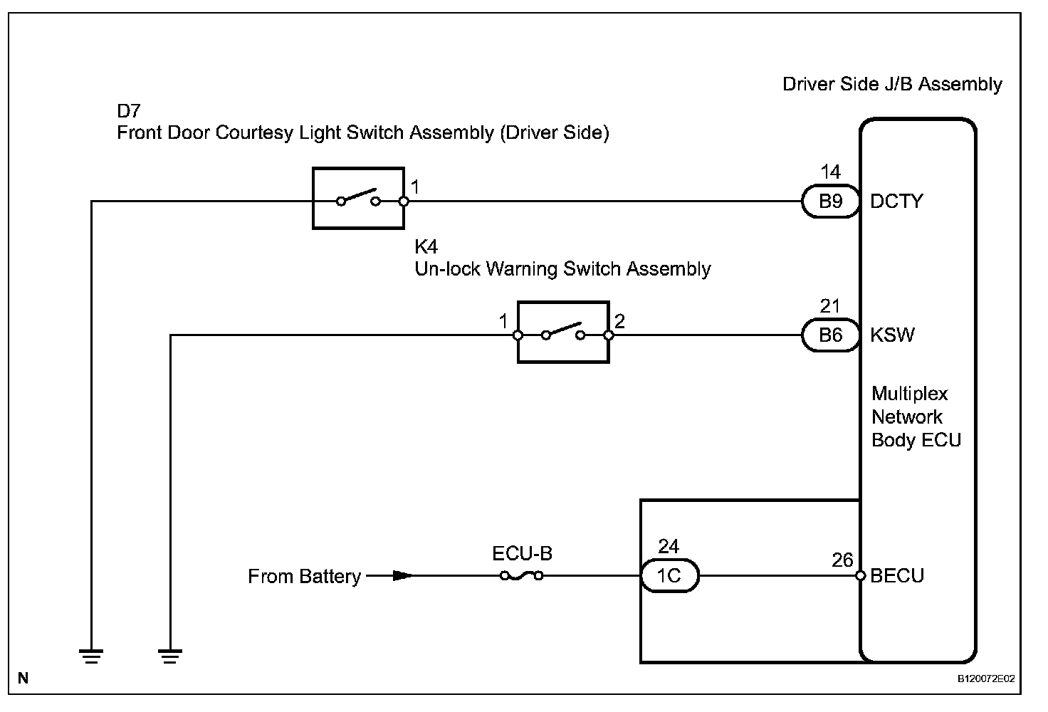 The un-lock warning switch turns ON when the key is inserted in the ignition key cylinder. The courtesy light switch turns ON when the driver side door is opened. These 2 switches are monitored by the body ECU.