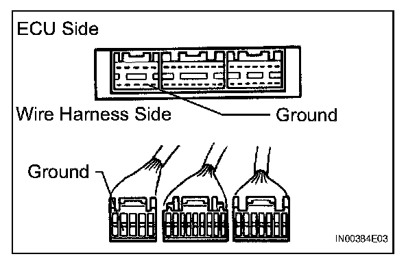 2. Disconnect the ECU connector. Check the ground terminal on the ECU side and wire harness side for bending, corrosion or foreign matter. Lastly, check the contact pressure of the female terminals.