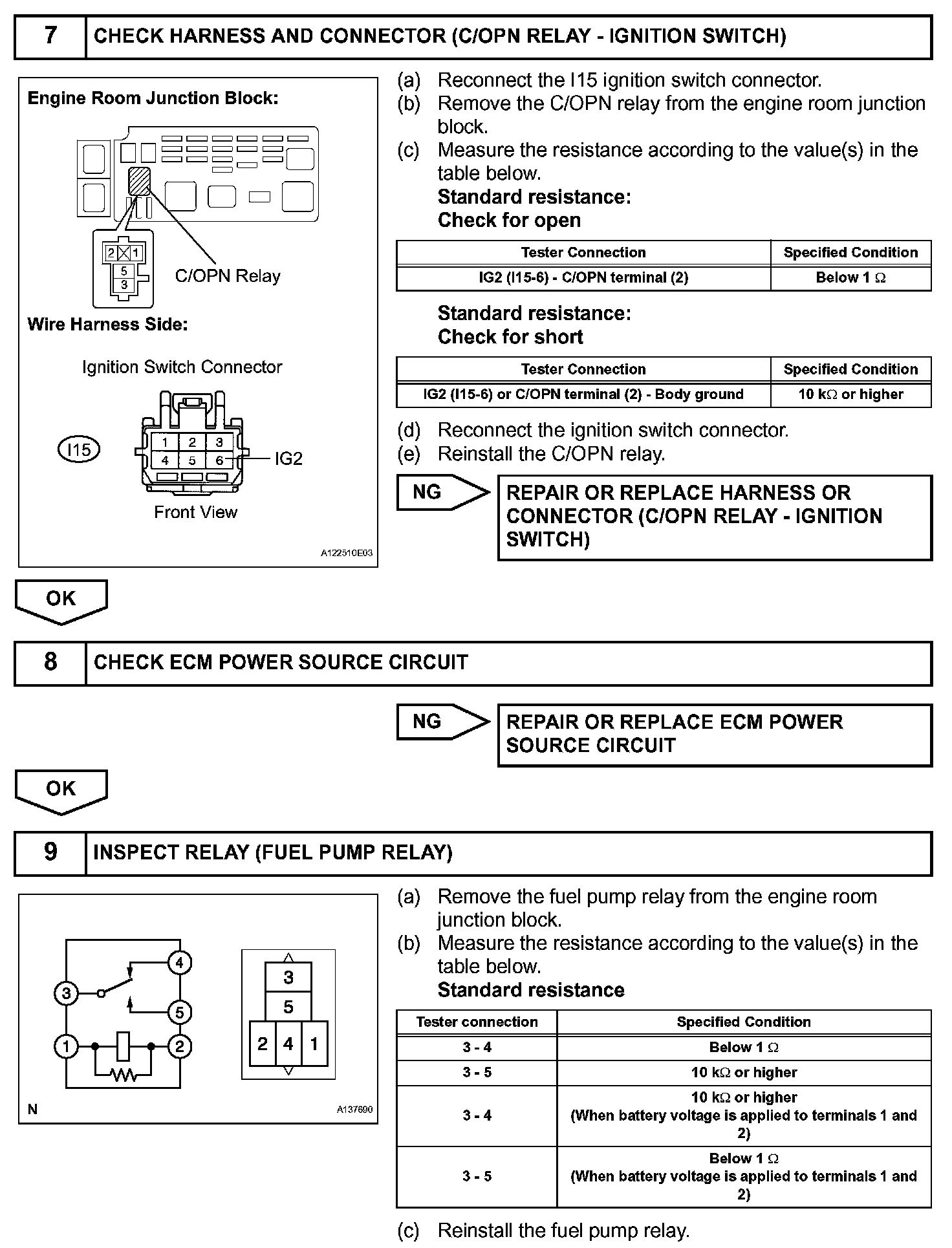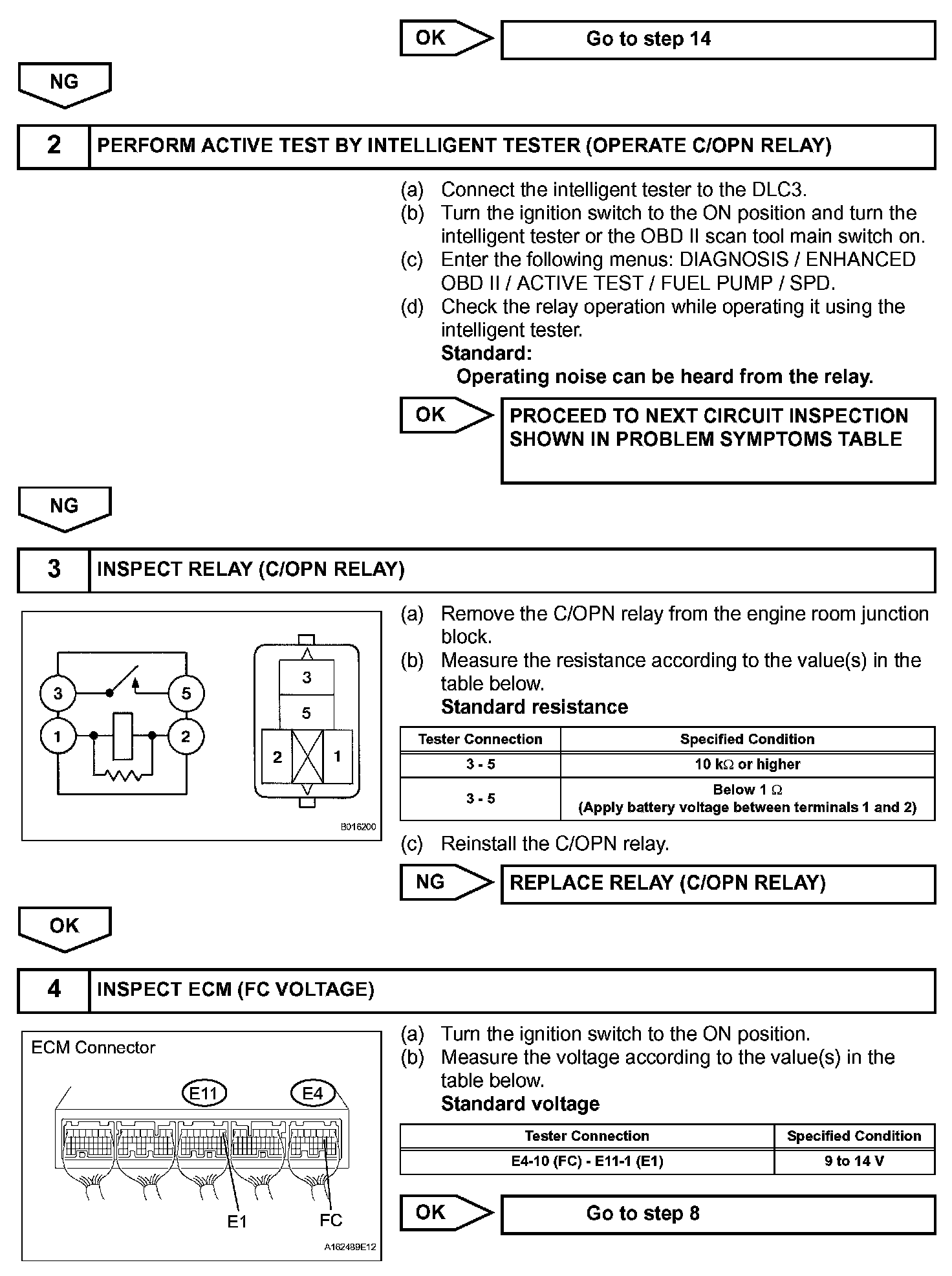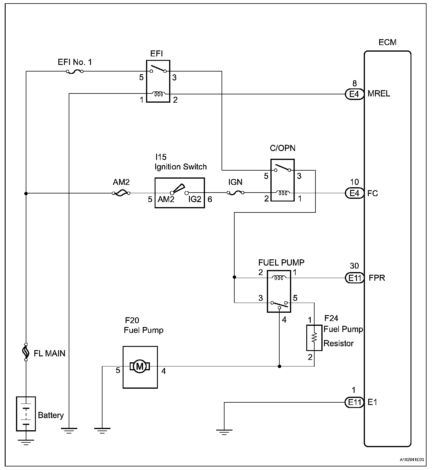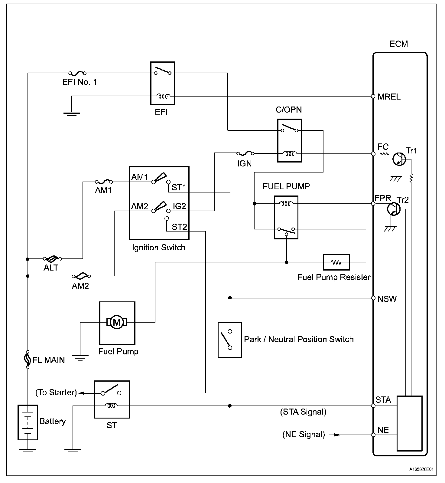 The FUEL PUMP relay switches the fuel pump speed according to the engine conditions. The fuel pump operates when the ECM receives the starter-operating signal (STA) and crankshaft-rotating signal (NE).