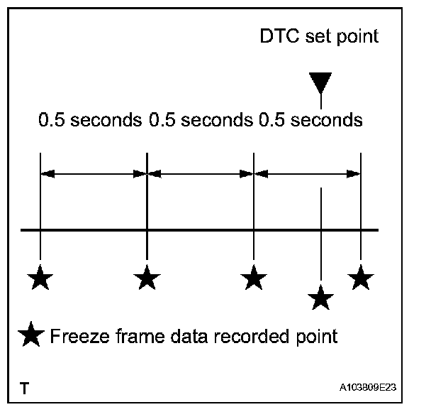 HINT: If it is impossible to duplicate the problem even though a DTC is detected, confirm the freeze frame data. The ECM records engine conditions in the form of freeze frame data every 0.5 seconds. Using the intelligent tester, 5 separate sets of freeze frame data can be checked.