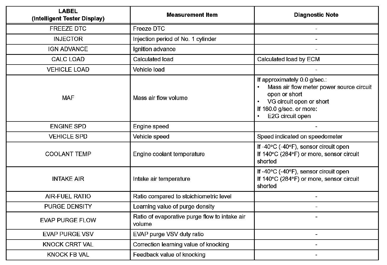 The ECM records vehicle and driving condition information as freeze frame data the moment a DTC is stored. When troubleshooting, freeze frame data can be helpful in determining whether the vehicle was running or stopped, whether the air-fuel ratio was lean or rich, as well as other data recorded at the time of a malfunction.