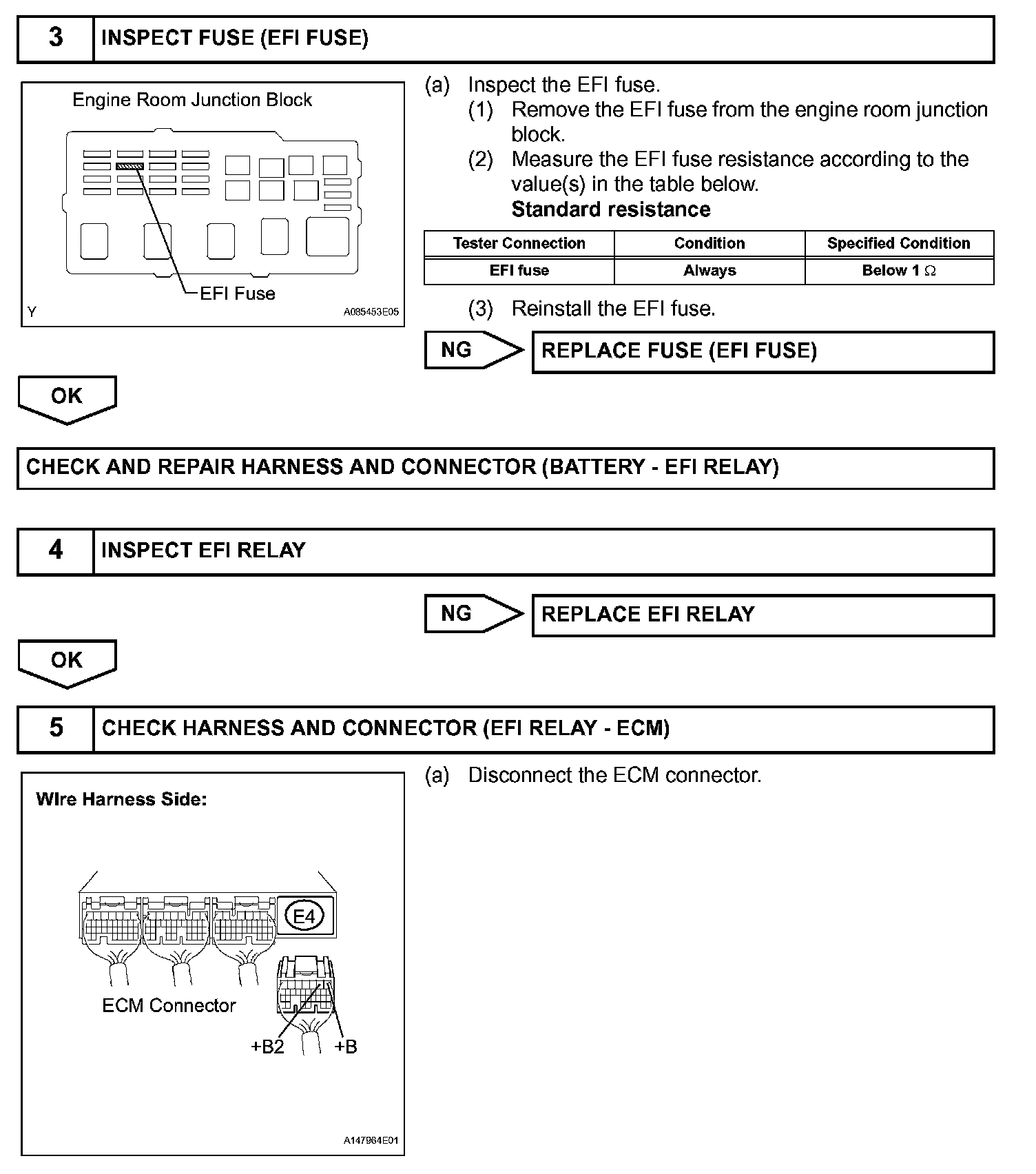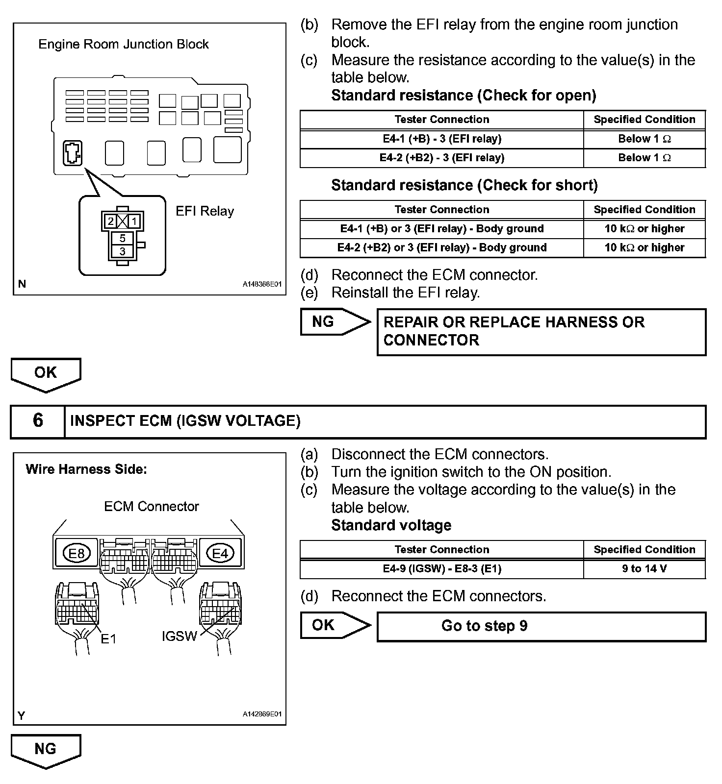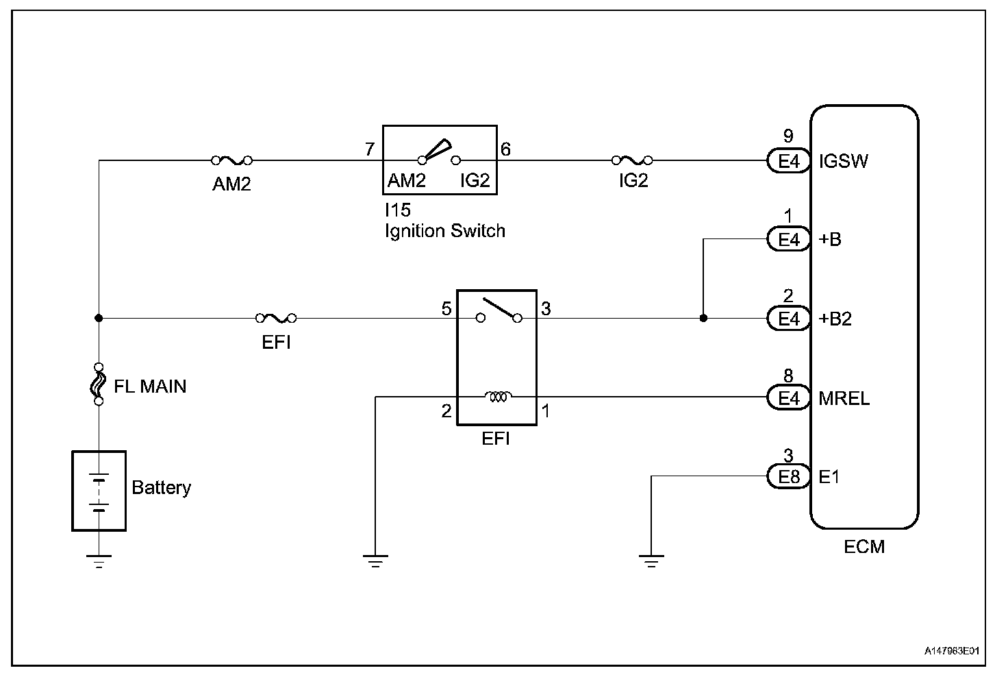 When the ignition switch is turned to the ON position, the battery voltage is applied to IGSW of the ECM. The output signal from the MREL terminal of the ECM causes a current to flow to the coil, closing the contacts of the EFI relay and supplying power to either terminal +B or +B2 of the ECM.