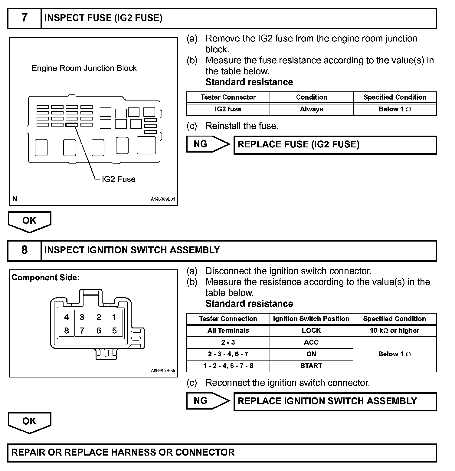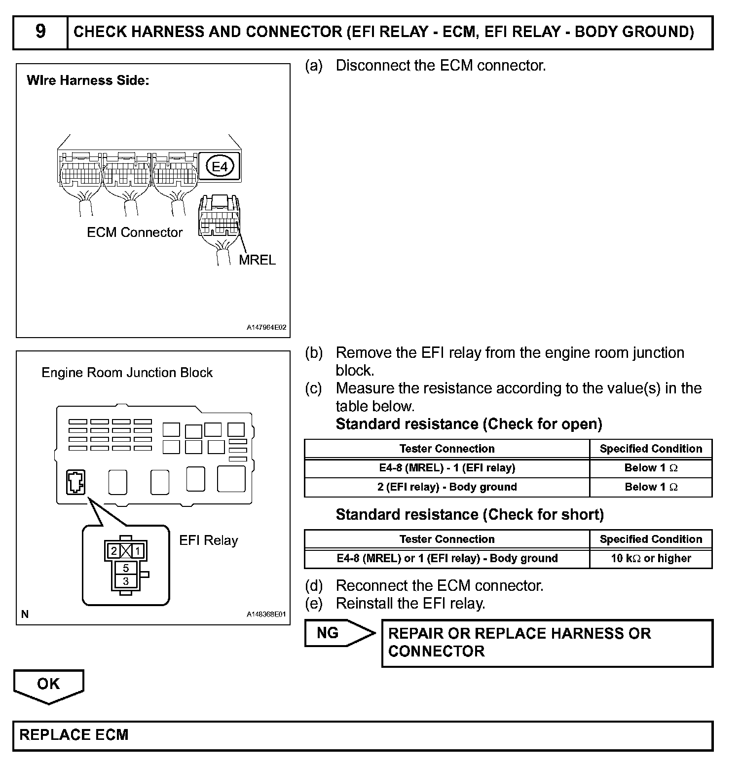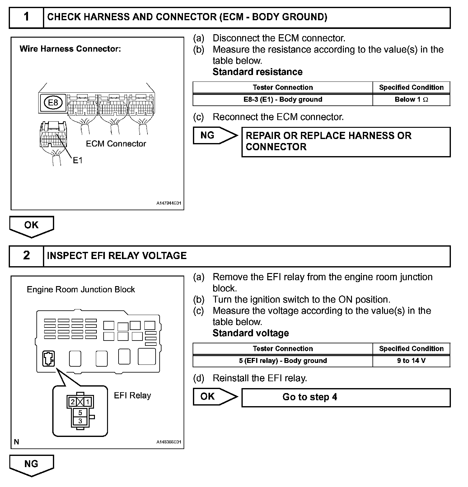 When the ignition switch is turned to the ON position, the battery voltage is applied to IGSW of the ECM. The output signal from the MREL terminal of the ECM causes a current to flow to the coil, closing the contacts of the EFI relay and supplying power to either terminal +B or +B2 of the ECM.