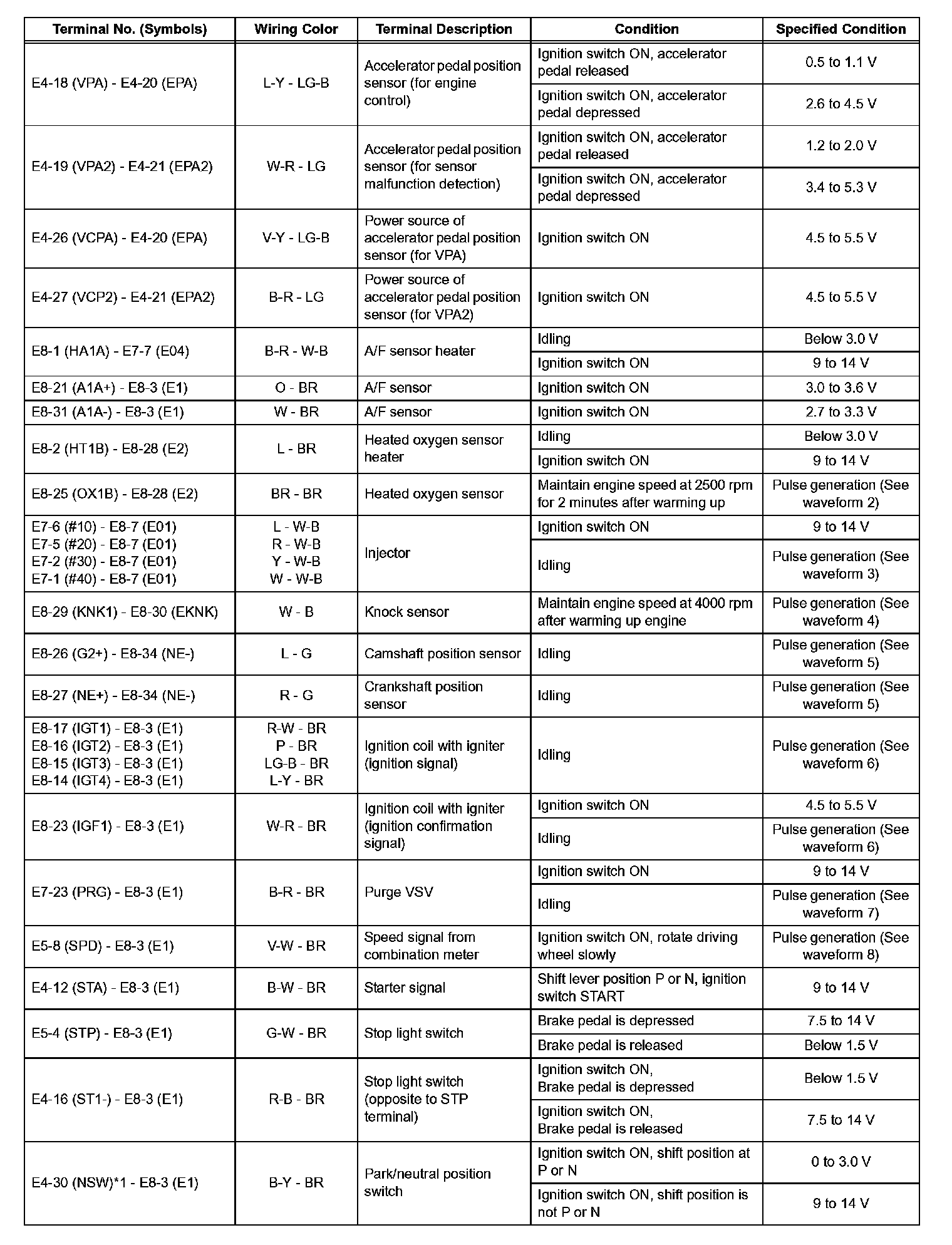 Pinout Values and Diagnostic Parameters
