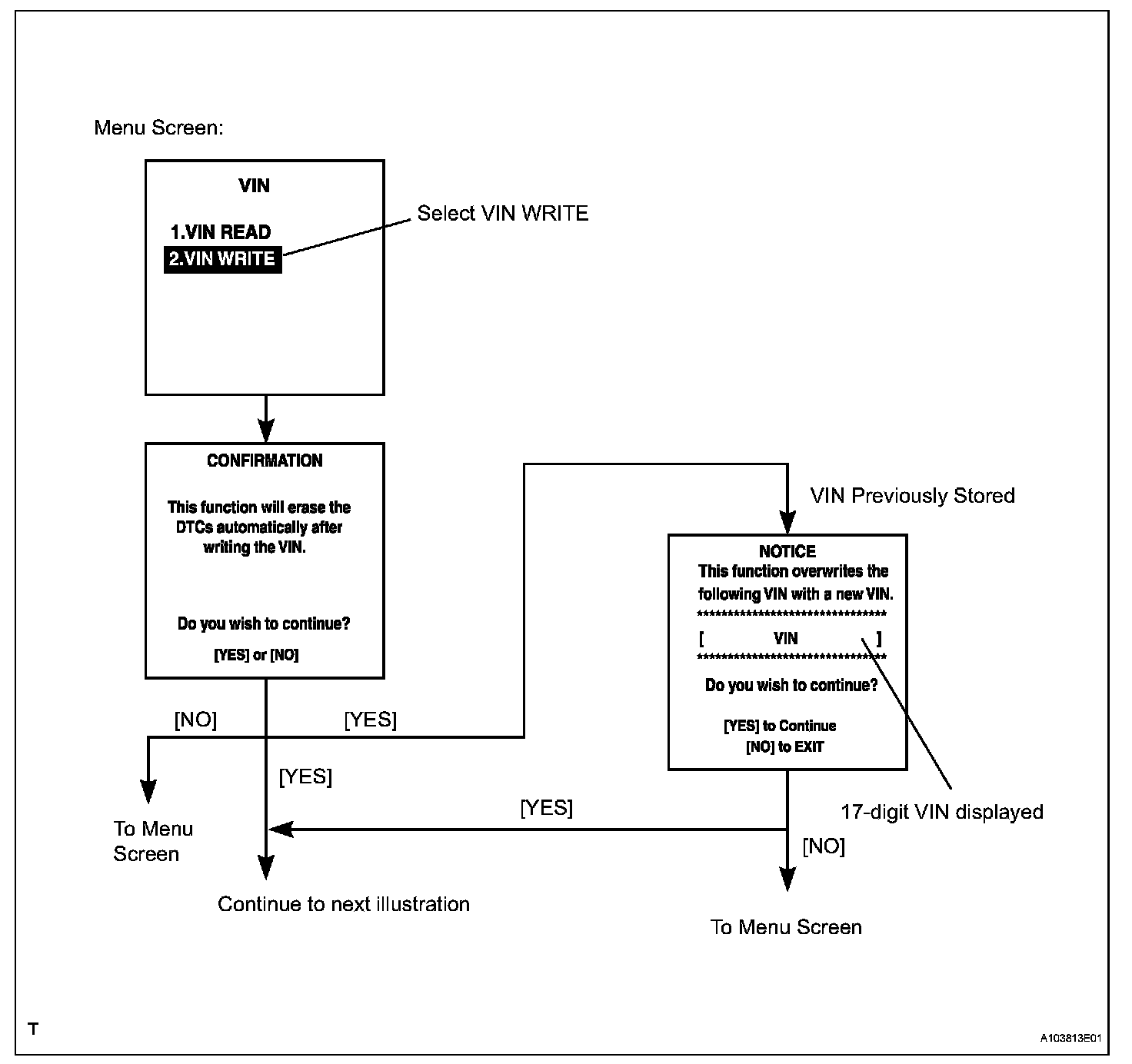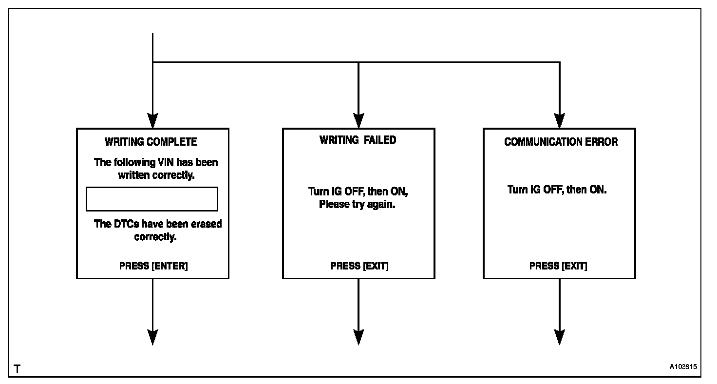 a. The VIN writing process is shown in the flow chart. This process allows the VIN to be input into the ECM. If the ECM is changed, or the ECM VIN and Vehicle VIN do not match, the VIN can be registered, or overwritten in the ECM by following this procedure.