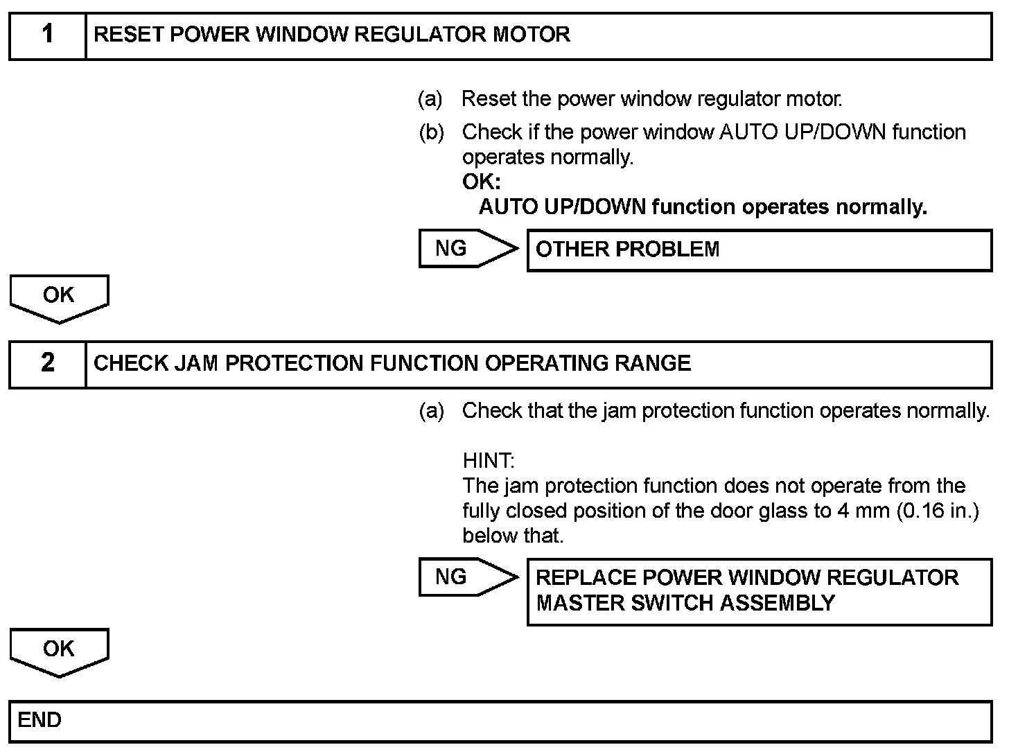 The power window regulator master switch controls the driver side power window regulator motor. The jam protection function operates only within the specified range during AUTO UP operation or key-off manual UP operation.