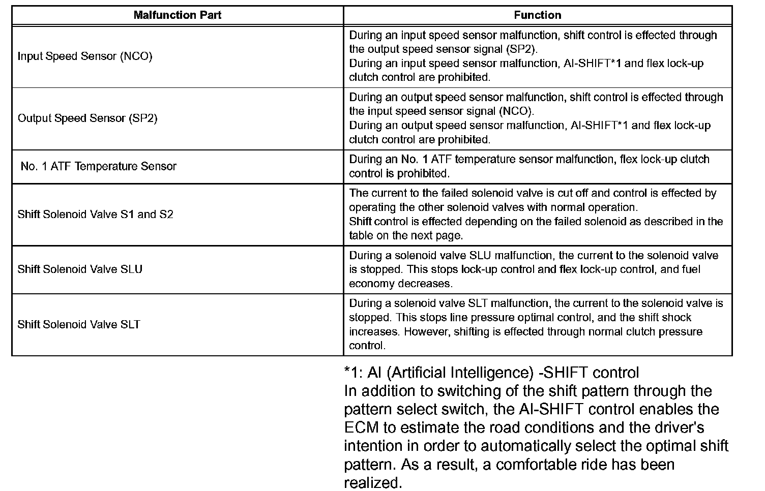 This function minimizes the loss of the ECT (Electronic Controlled Automatic Transmission) functions when any malfunction occurs in each sensor or solenoid.