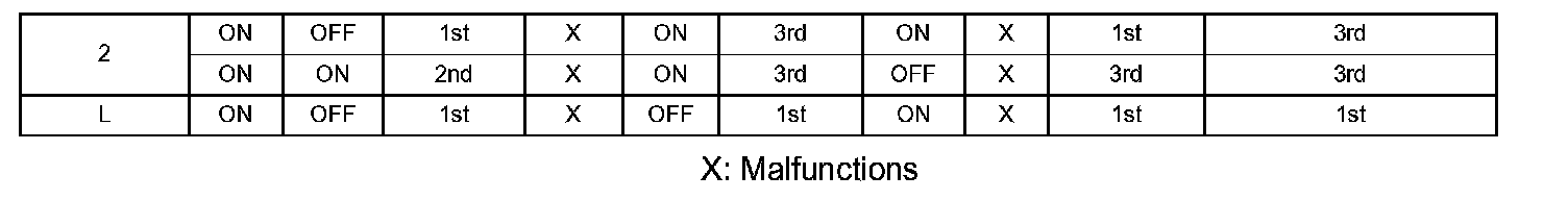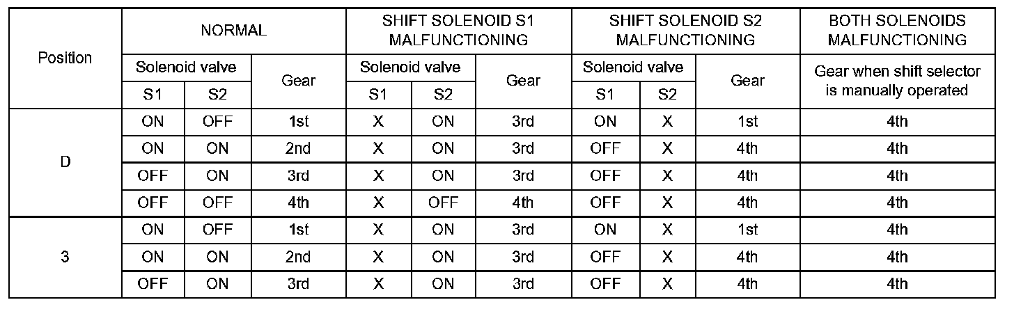 If either of the shift solenoid valve circuits has an open or short failure, the ECM turns the other shift solenoid "ON" and "OFF" in order to shift into the gear positions shown in the table below.
