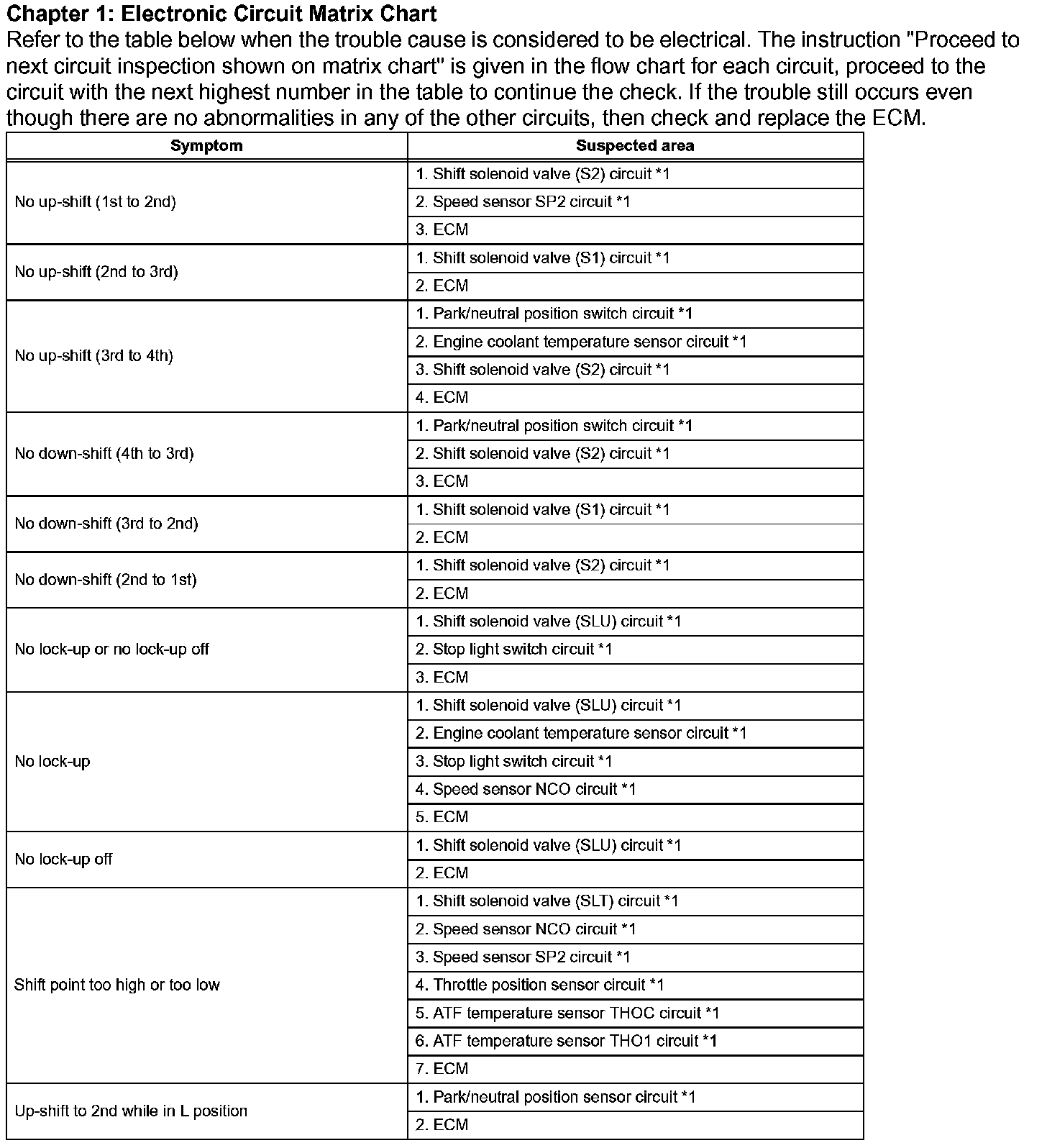 Refer to the table below when the trouble cause is considered to be electrical. The instruction "Proceed to next circuit inspection shown on matrix chart" is given in the flow chart for each circuit, proceed to the circuit with the next highest number in the table to continue the check. If the trouble still occurs even though there are no abnormalities in any of the other circuits, then check and replace the ECM.