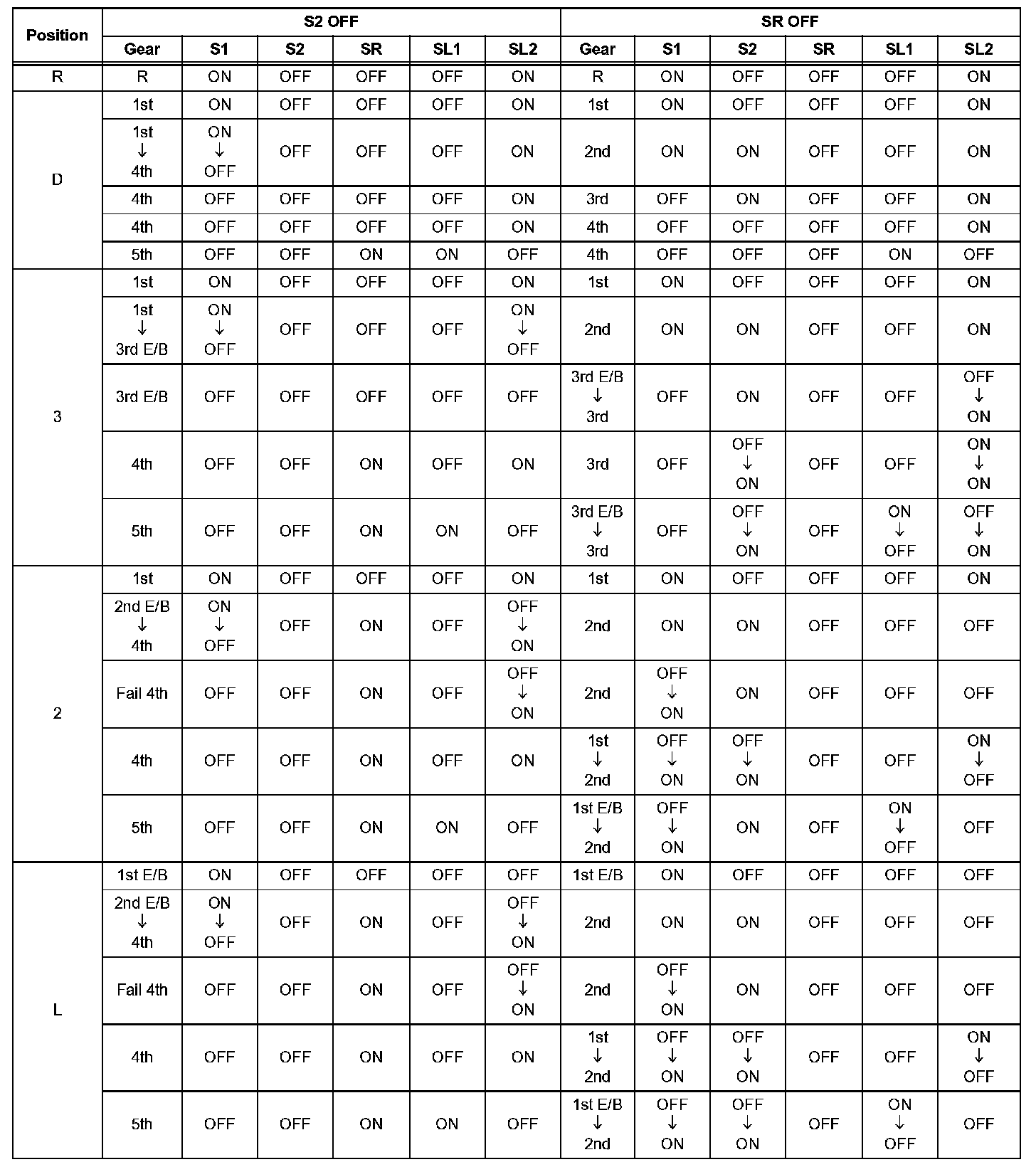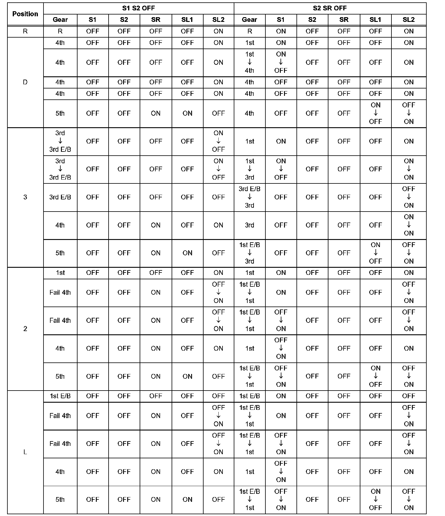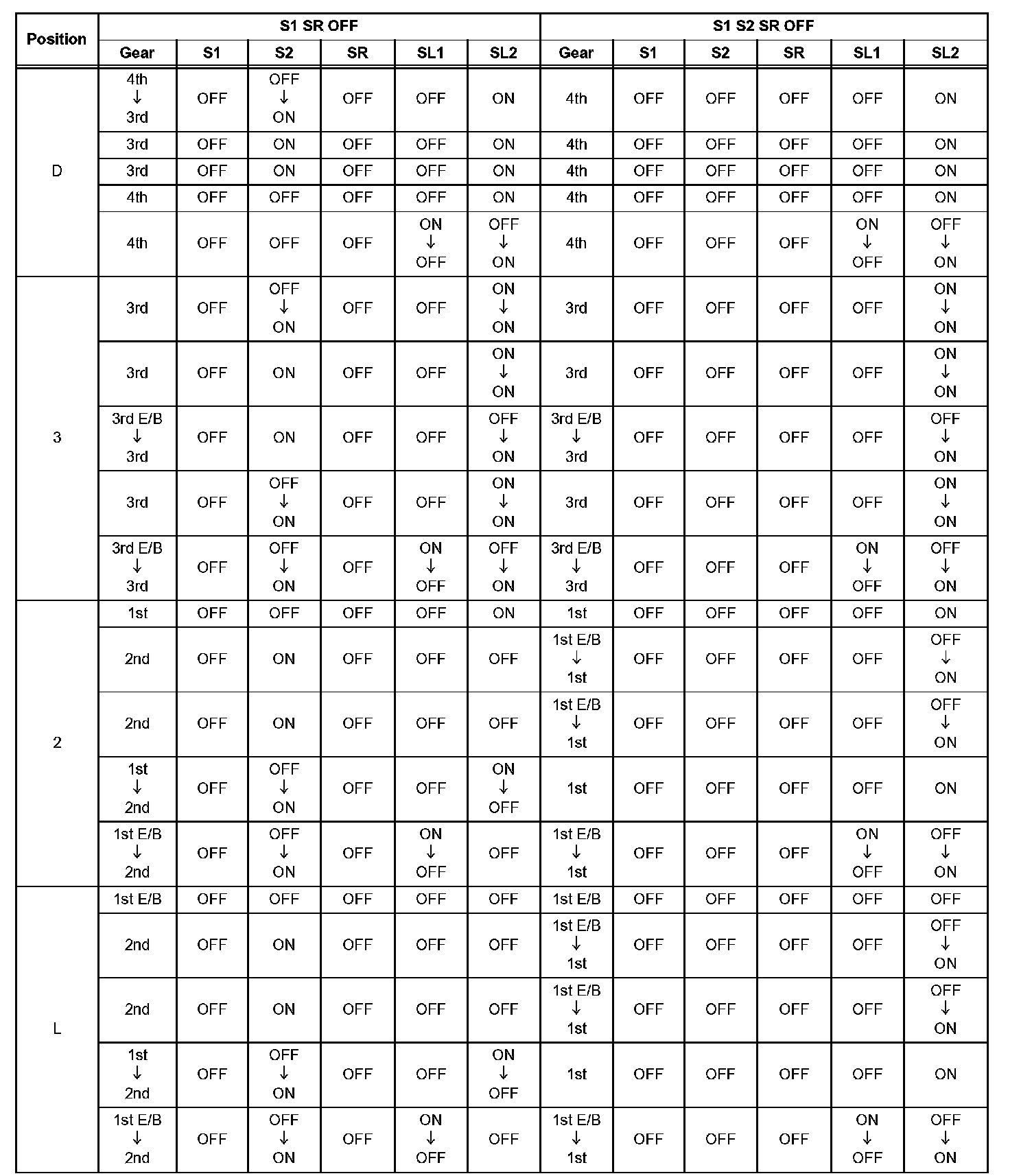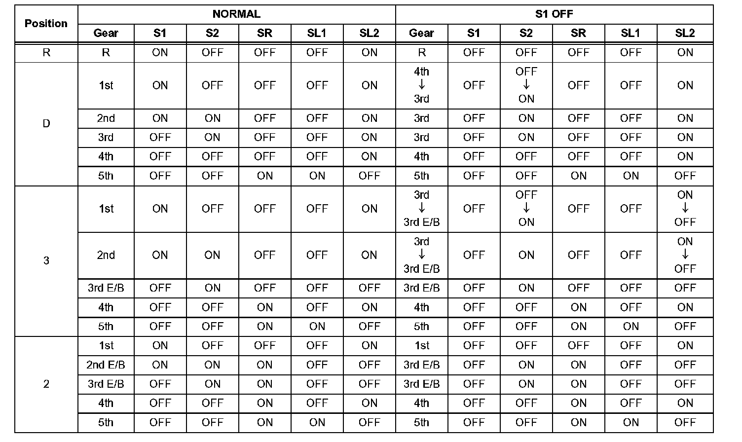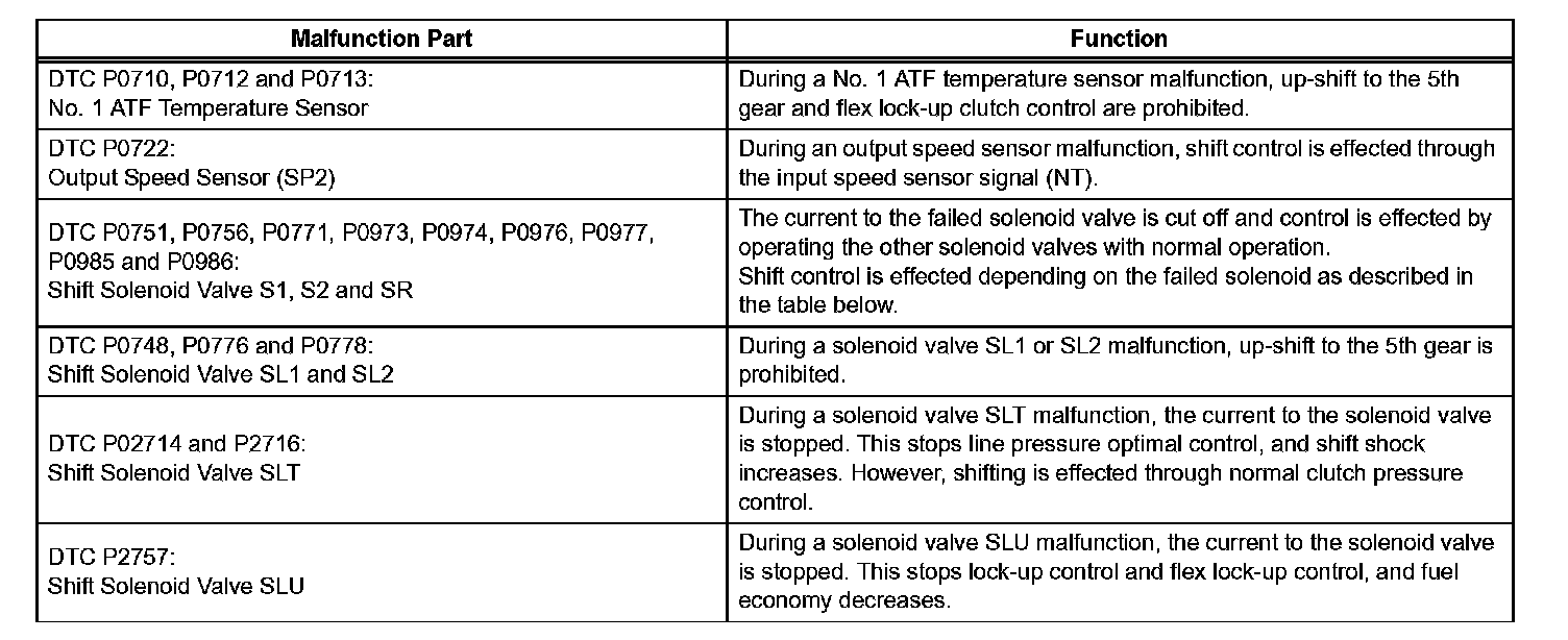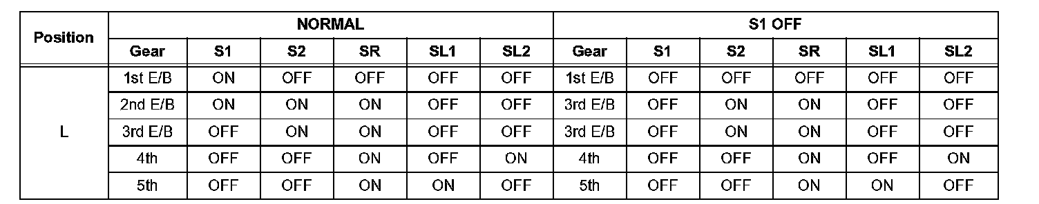 If either of the shift solenoid valve circuits has an open or short failure, the ECM turns the other shift solenoid ON and OFF in order to shift into the gear positions shown in the table below.