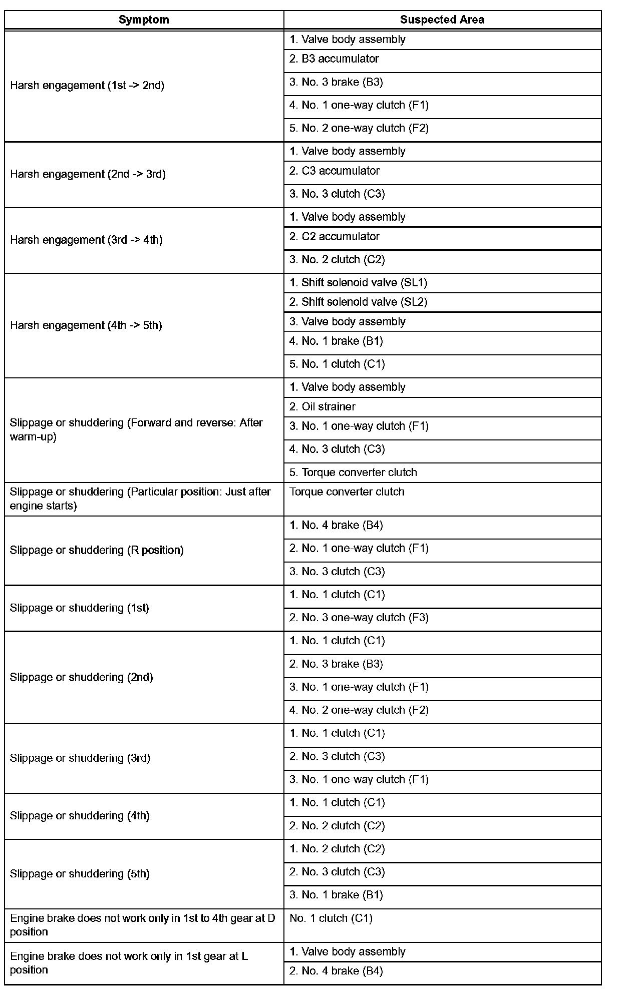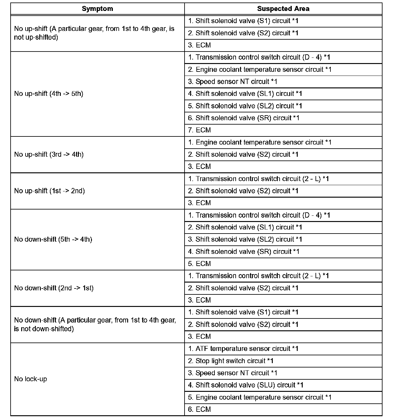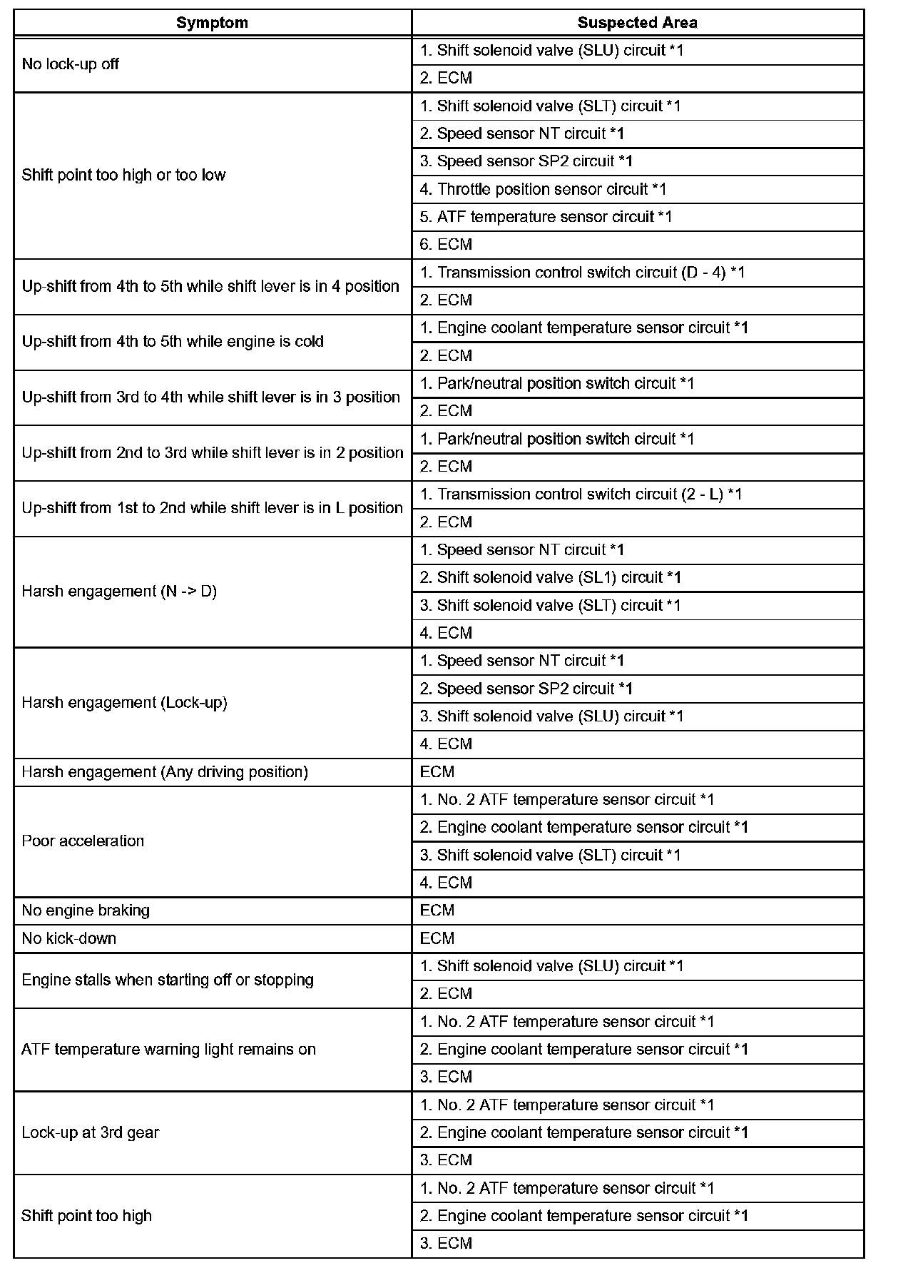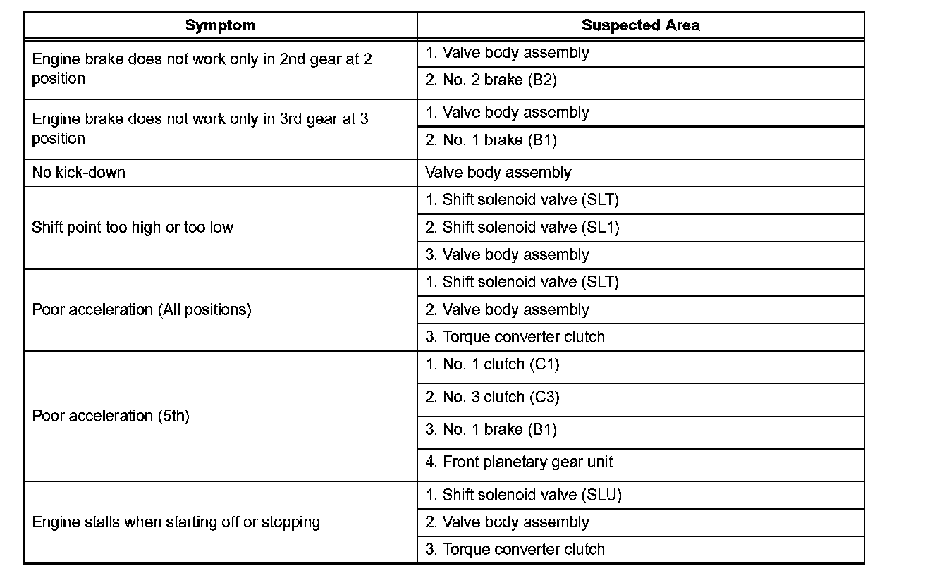 PROBLEM SYMPTOMS TABLEHINT: If no DTCs are displayed during the diagnostic trouble code check although the trouble still occurs, check the electrical circuits for each symptom in the order given and proceed to the symptom given for troubleshooting.