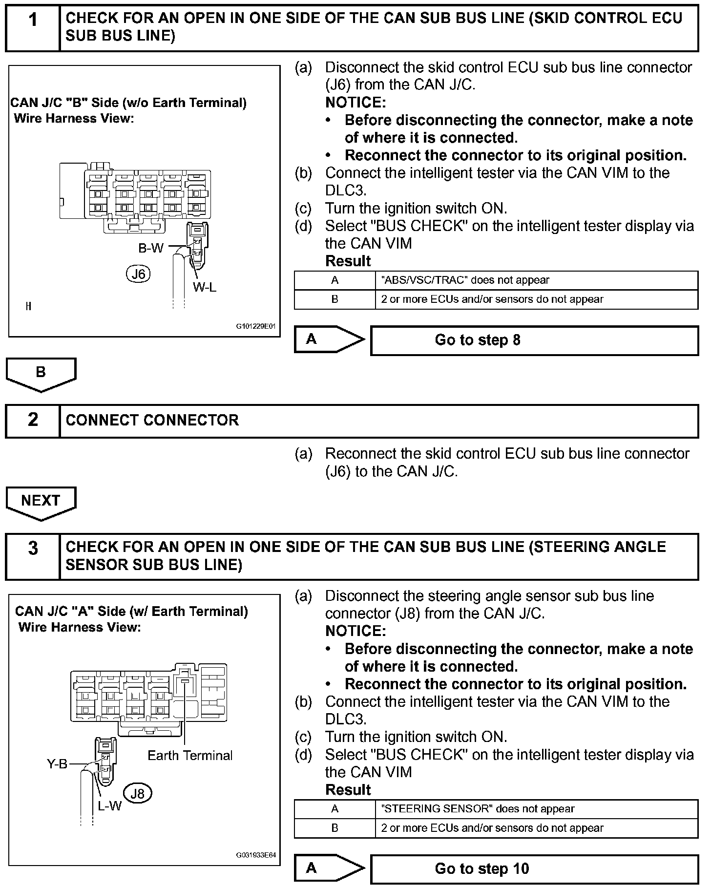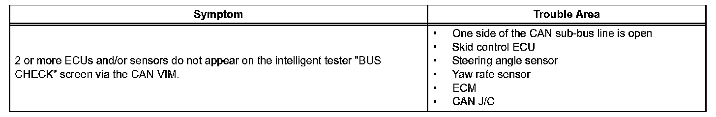 Open in One Side of CAN Sub Bus Line DESCRIPTION If 2 or more ECUs and/or sensors do not appear on the intelligent tester "BUS CHECK" screen via the CAN VIM , one side of the CAN sub-bus line may be open. (ONE side of the CAN-H [sub-bus line] / CANL [sub-bus line] of the ECU and/or sensor is open.)