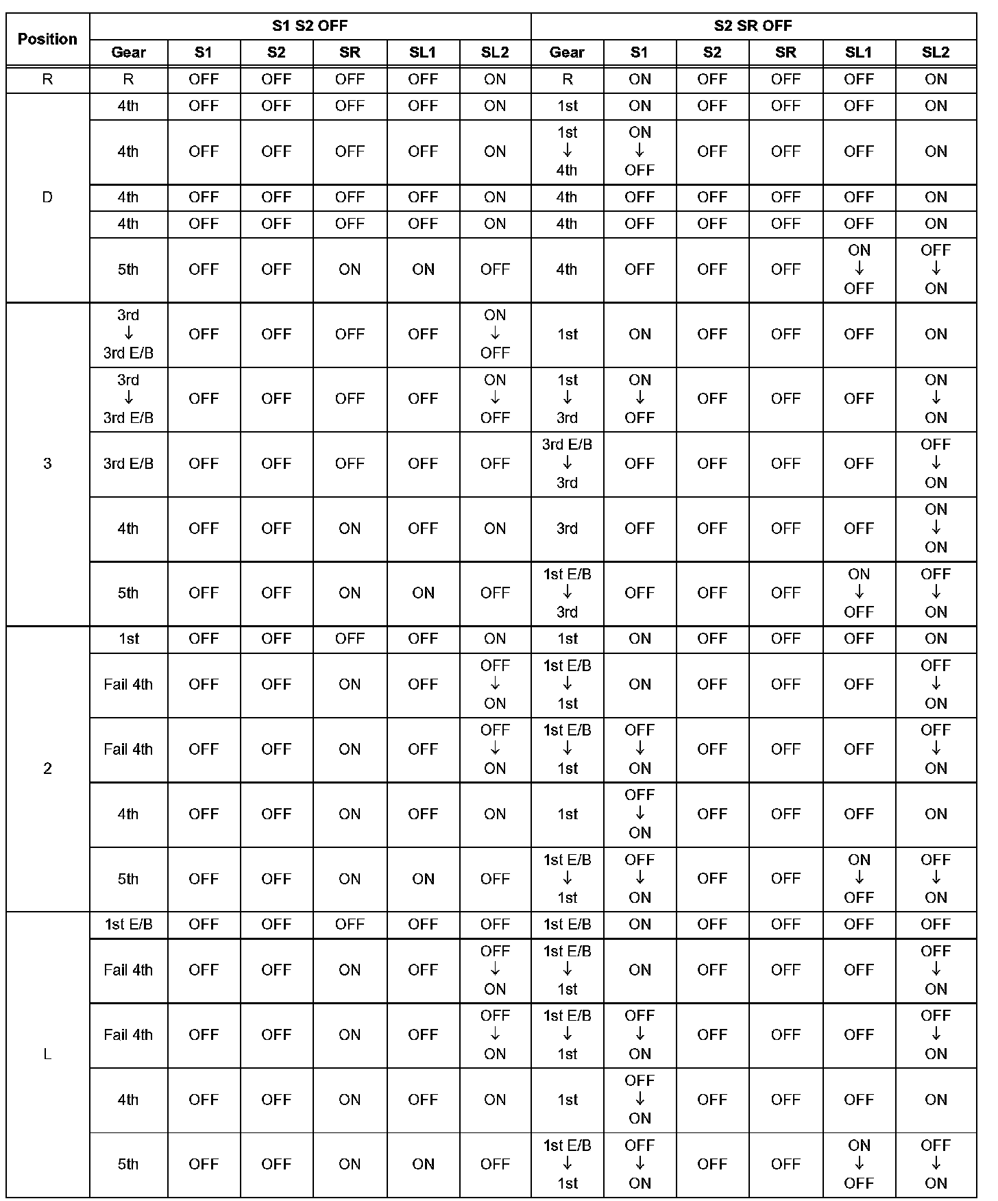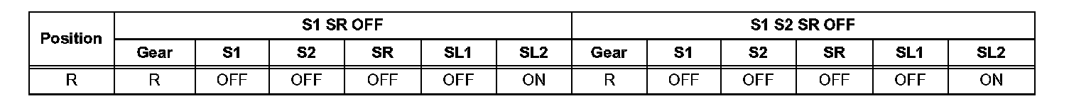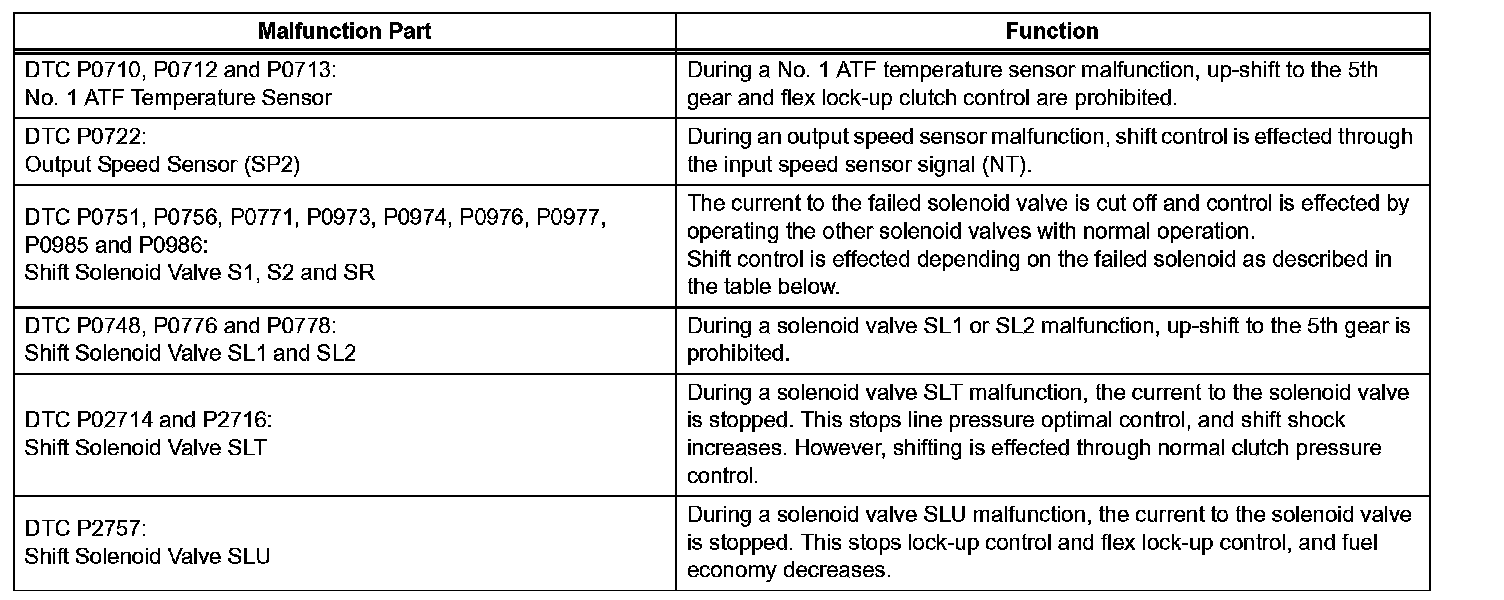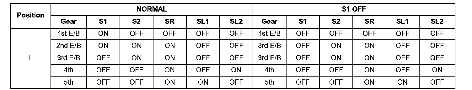 If either of the shift solenoid valve circuits has an open or short failure, the ECM turns the other shift solenoid ON and OFF in order to shift into the gear positions shown in the table below.