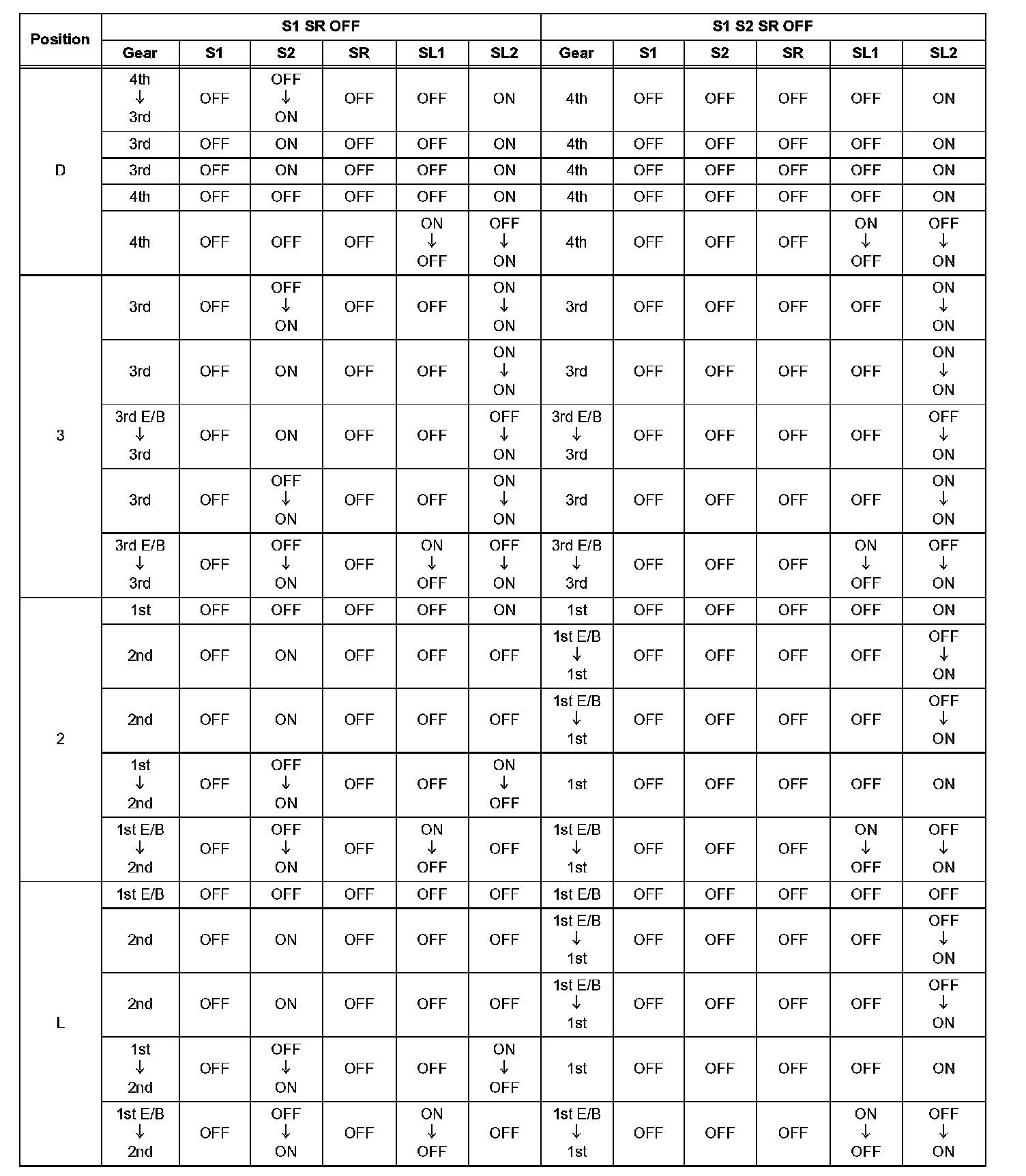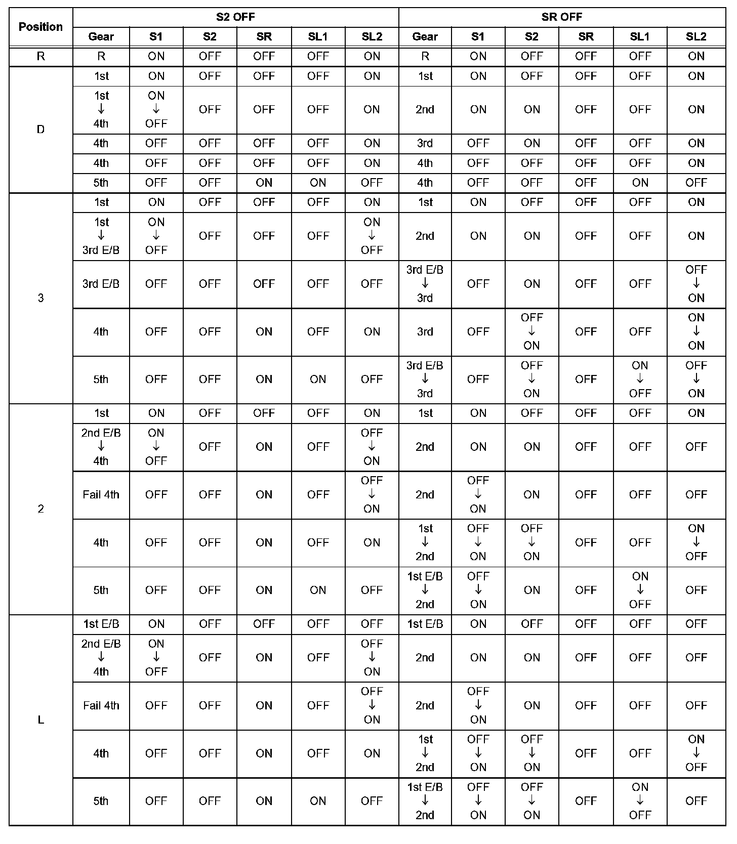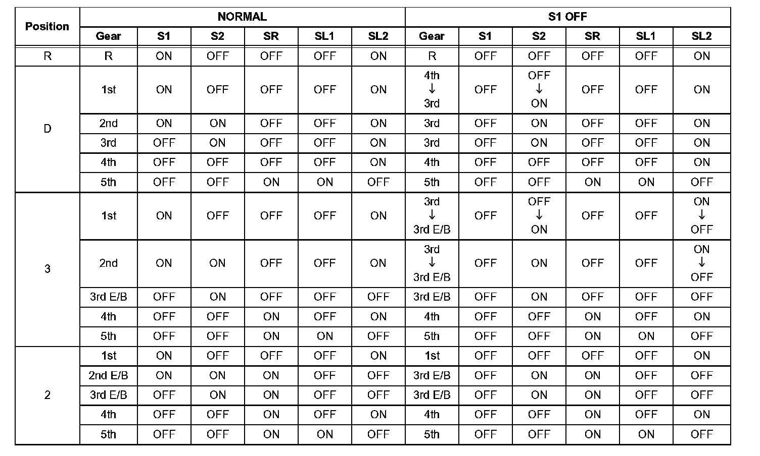 If either of the shift solenoid valve circuits has an open or short failure, the ECM turns the other shift solenoid ON and OFF in order to shift into the gear positions shown in the table below.