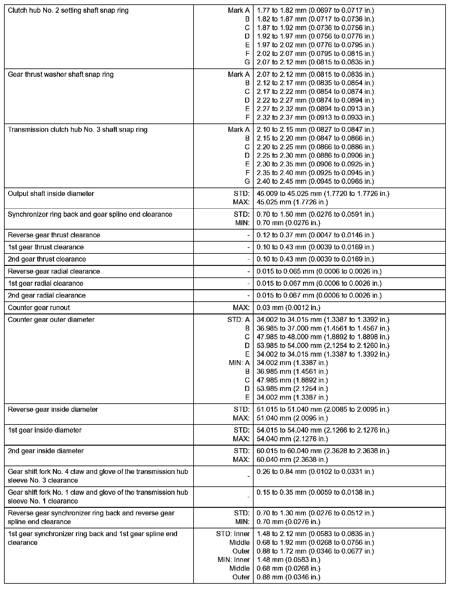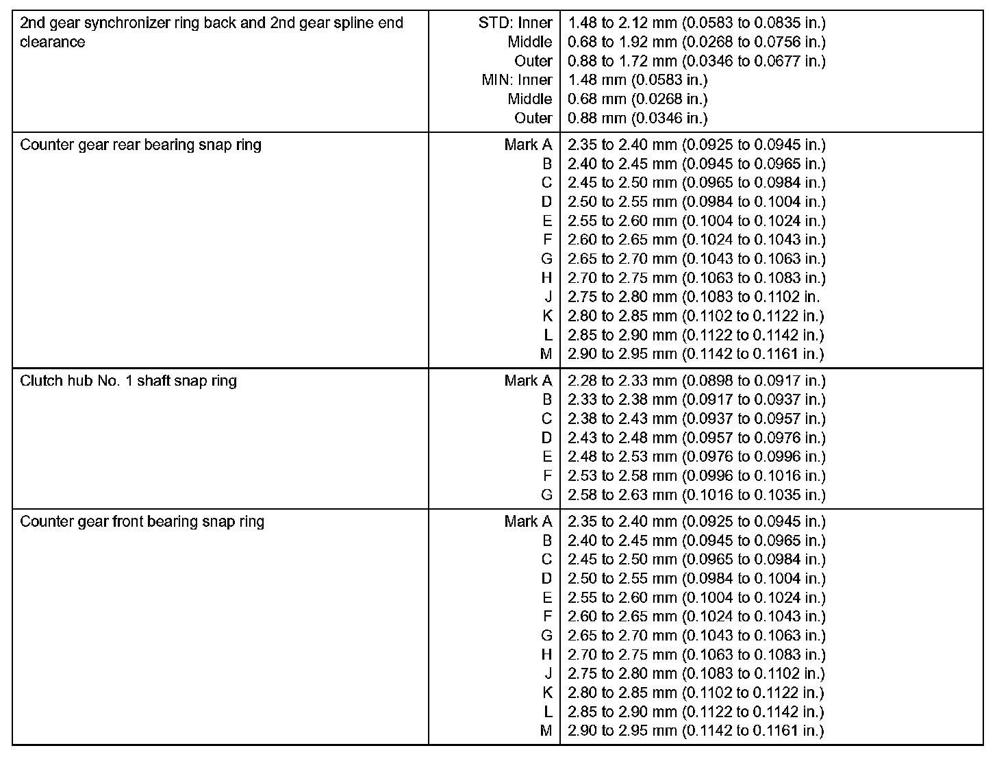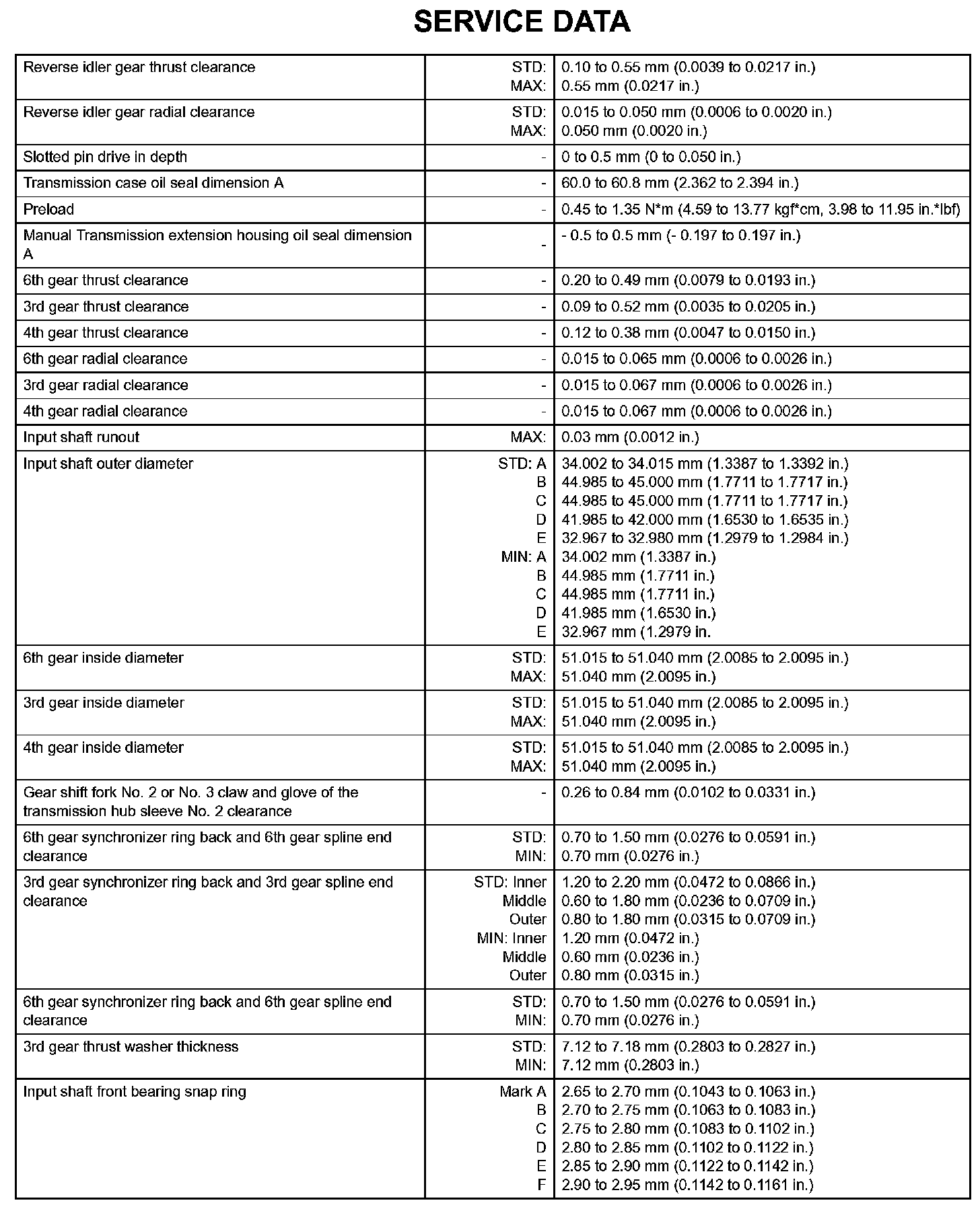 Manual Transmission - Service Data (Part 2):
