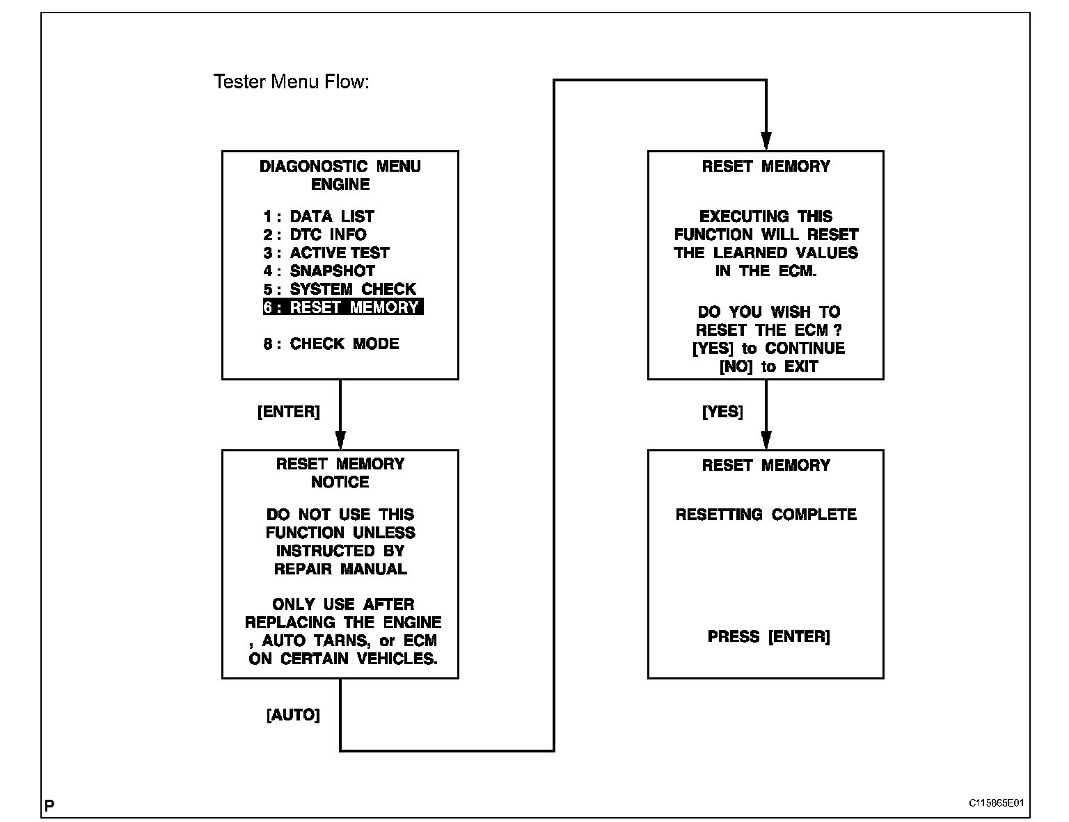 HINT: The ECM stores the condition under which the ECT (Electronic Controlled Automatic Transmission) controls the automatic transmission and engine assemblies according to their characteristics. Therefore, when the automatic transmission assembly, engine assembly, or ECM has been replaced, it is necessary to reset the memory so that the ECM can store the new information. Reset procedure is as follows.