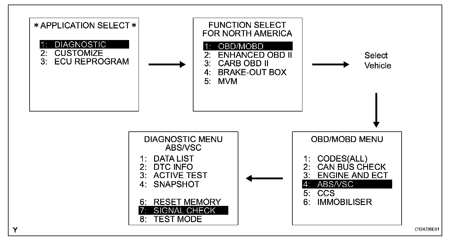 f. Switch the ECU to test mode using the intelligent tester. Select the following menu items: DIAGNOSIS / OBD/MOBD /select vehicle / ABS/ VSC / SIGNAL CHECK.