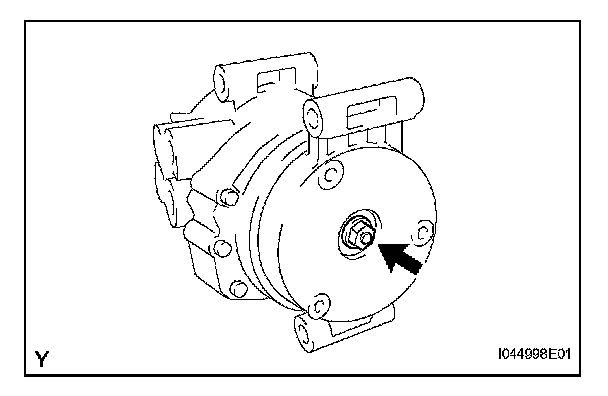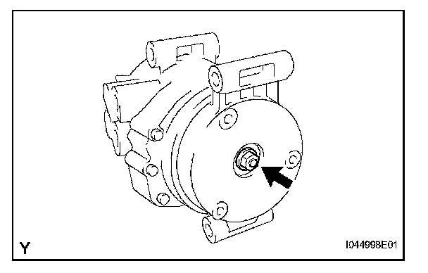 NOTE: Make sure that there is no foreign matter or oil on the compressor shaft, bolt, and clutch hub.