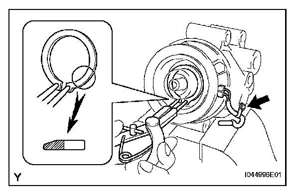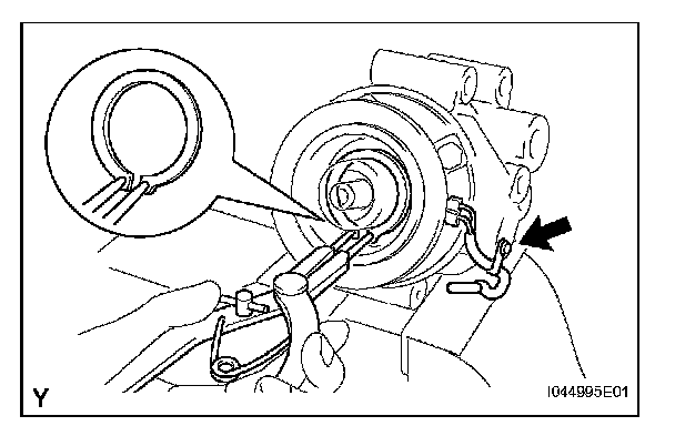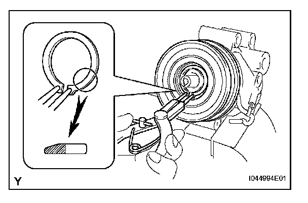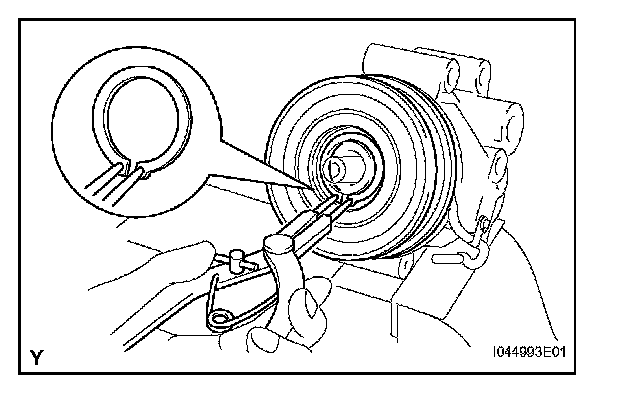 c. Using SST, remove the snap ring and magnet clutch rotor