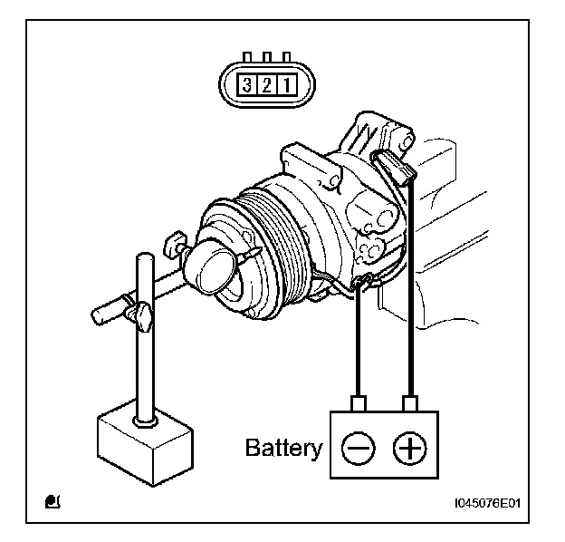 c. Connect the battery positive lead to terminal 1 (MG+) of the magnet clutch connector and the negative lead to the earth wire. Turn the magnet clutch on and off and measure the clearance.