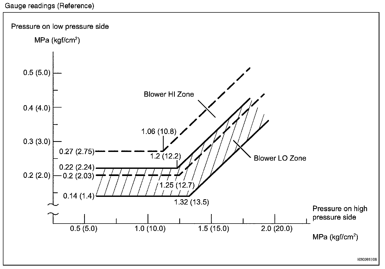 Low pressure side: 0.15 to 0.25 MPa (1.5 to 2.5 kgf/sq.cm)