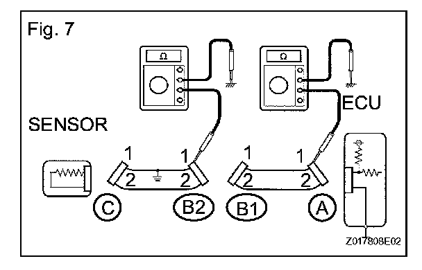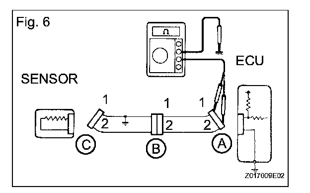 HINT: Measure the resistance while lightly shaking the wire harness vertically and horizontally. If your results match the examples, a short circuit exists between terminal 1 of connector A and terminal 1 of connector C.