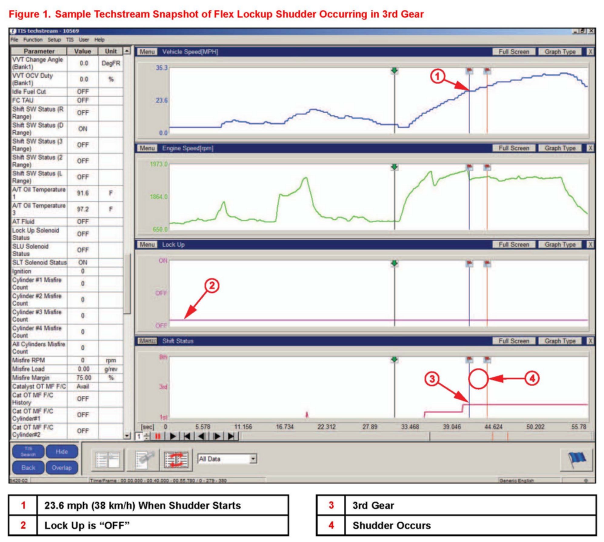 2. Use TIS Techstream to take a snapshot when shudder vibration is occurring to confirm that it occurs when in 3rd or 4th gear while lightly accelerating.