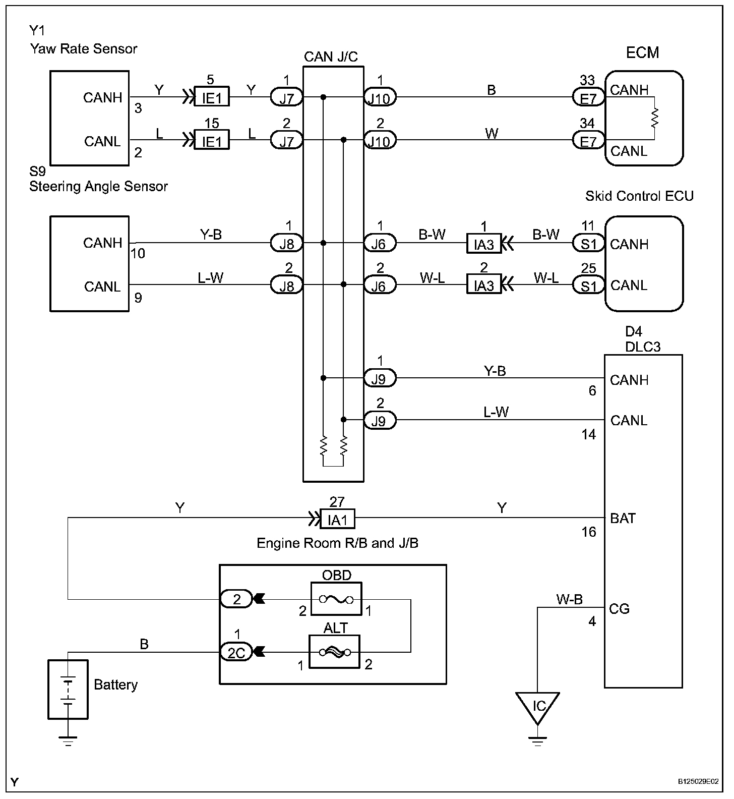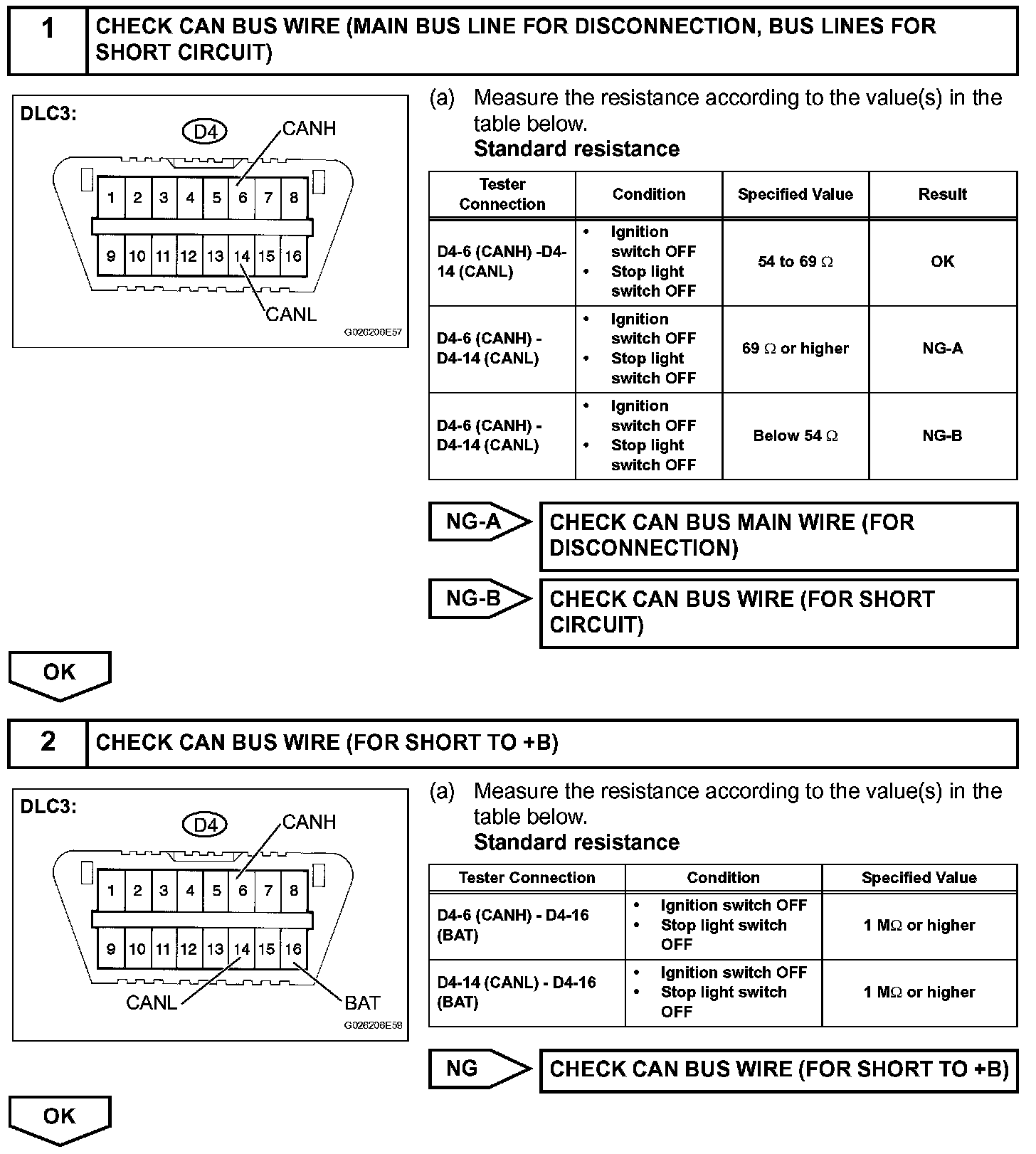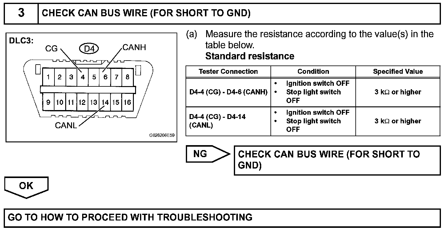 When any DTC of the CAN communication system is output, first measure the resistance between the terminals of the DLC3 and the yaw rate sensor connector to specify the trouble area.