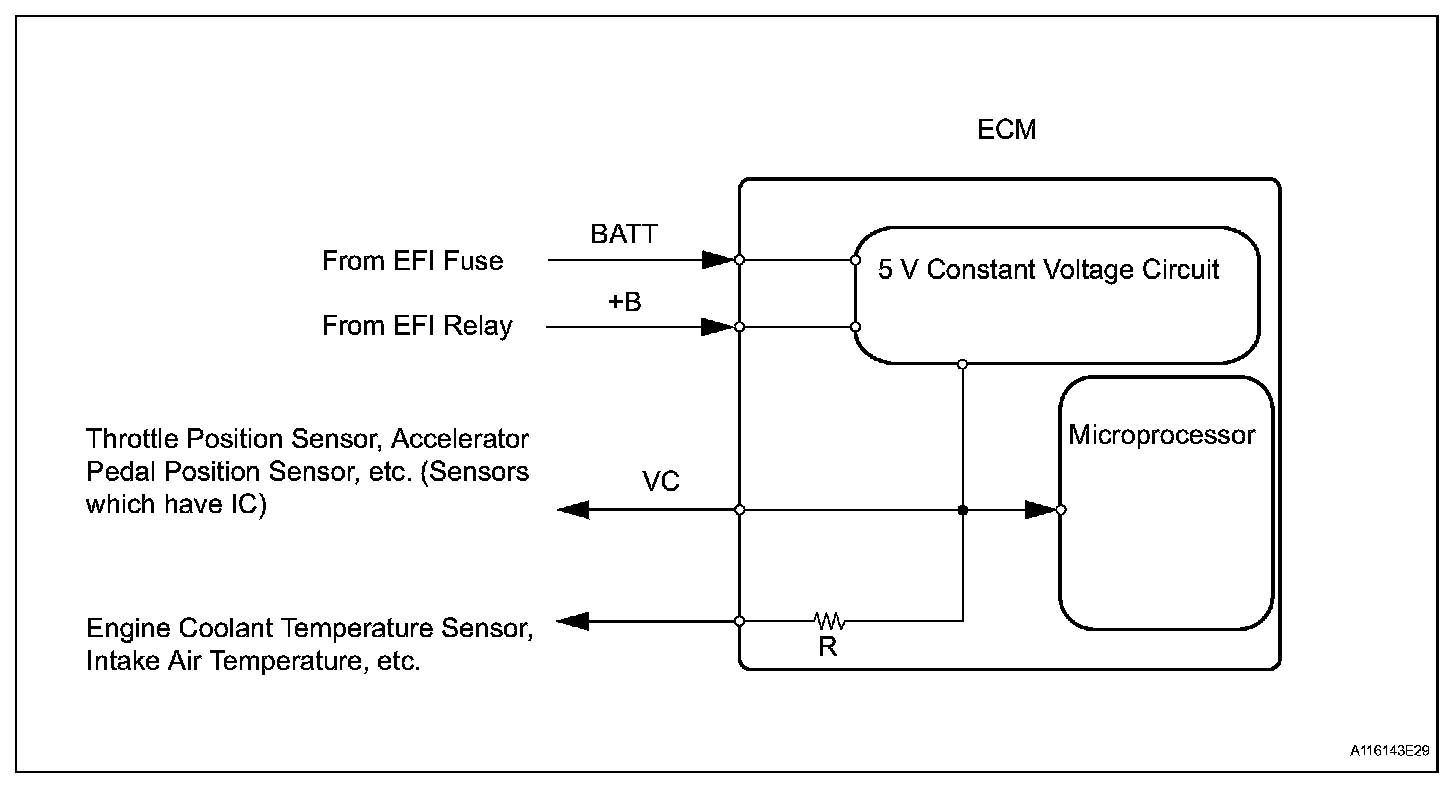The ECM constantly generates 5 V power from the battery voltage supplied to the +B (BATT) terminal to operate the microprocessor. The ECM also provides this power to the sensors through the VC output circuit.