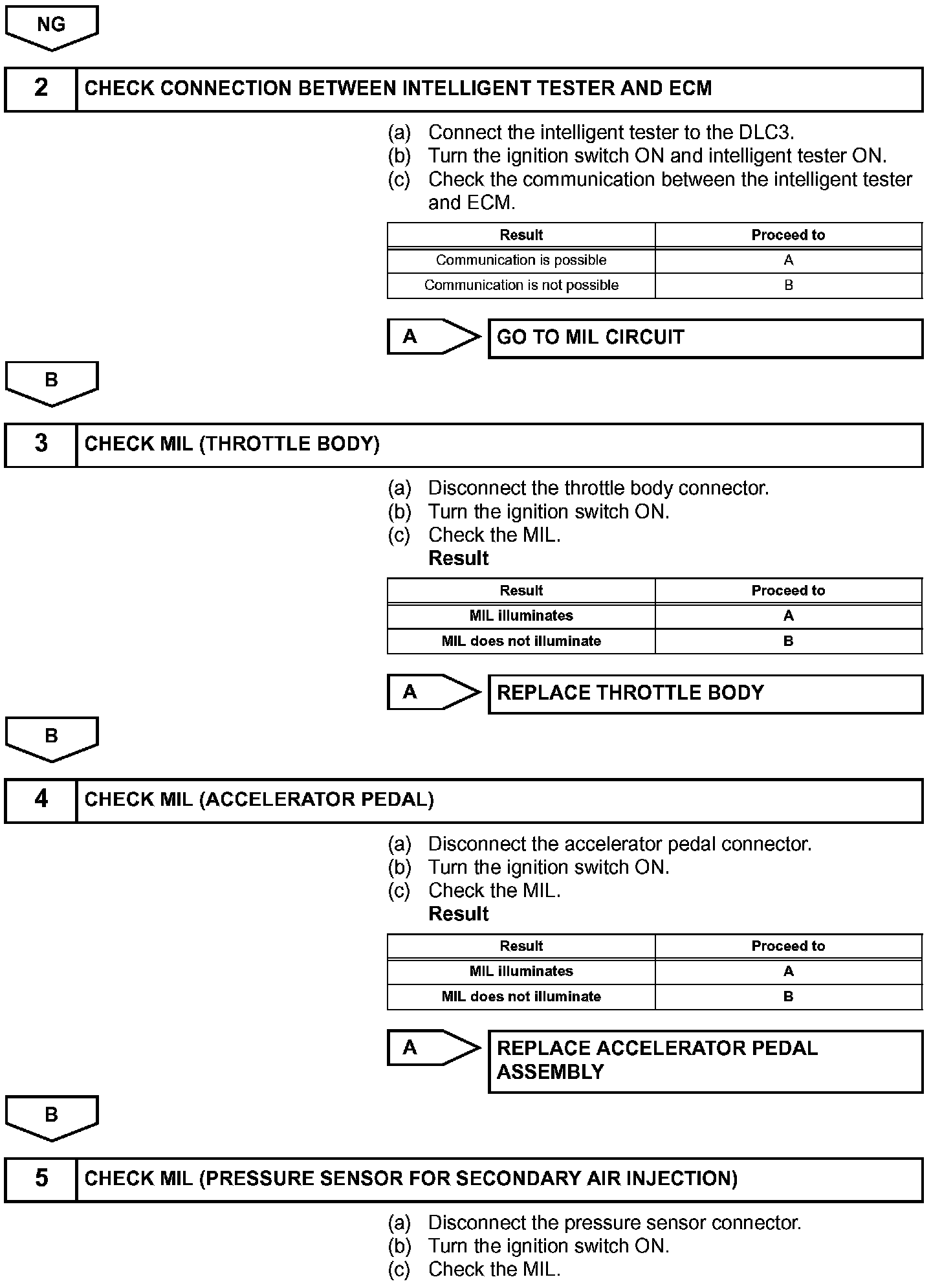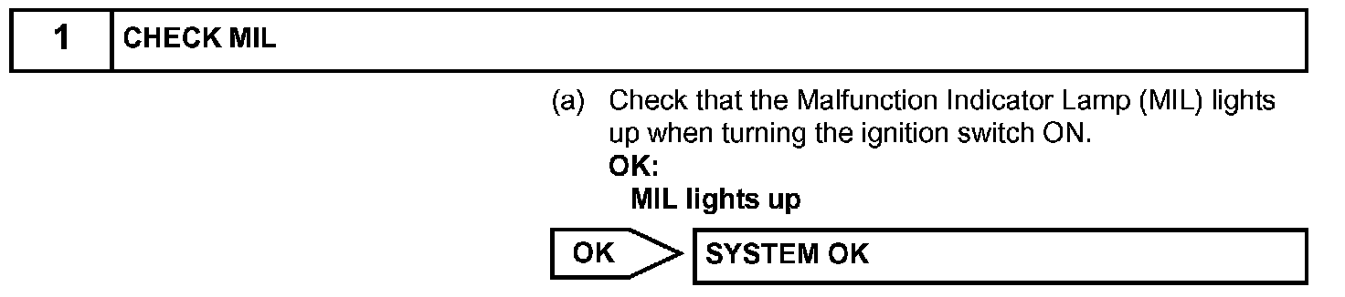 HINT: Under normal conditions, the MIL is illuminated for several seconds when the ignition switch is first turned to ON. The MIL goes off when the engine is started.